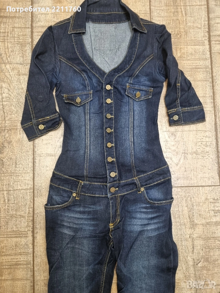 Страхотен гащеризон в тъмно син деним със захабен ефект. Стои по тялото, с копчета отпред и 3-4 ръкав. Може да се носи леко разкопчан с потник отдолу. Много хубав модел и цвят. Размер S. Материята е леко еластична. Обличан е веднъж за няколко часа.