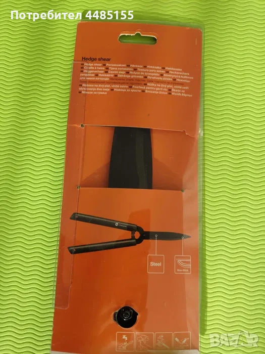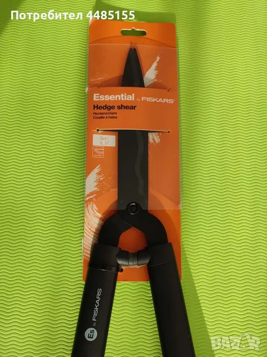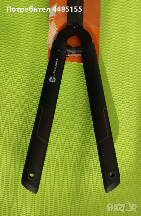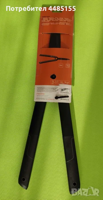 Качествена ножица на Fiskars за подрязване на храсти и живи плетове. Нова, неразопакована. Остриетата са стоманени с незалепващо покритие и са вълнообразно изрязани. Захватът е удобен и осигурява контрол при рязане на храстите.