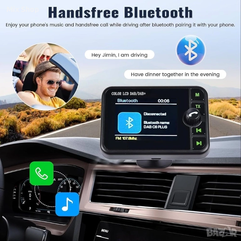 Bluetooth и TF карта и AUX: Адаптерът за DAB радио има Bluetooth функция, която прави по-удобно и безопасно да отговаряте на телефонни обаждания или да слушате Bluetooth музика по време на шофиране. Той също така поддържа възпроизвеждане на музика от карта с памет и осигурява висококачествен аудио изход чрез AUX (Забележка: AUX кабелът не е включен).