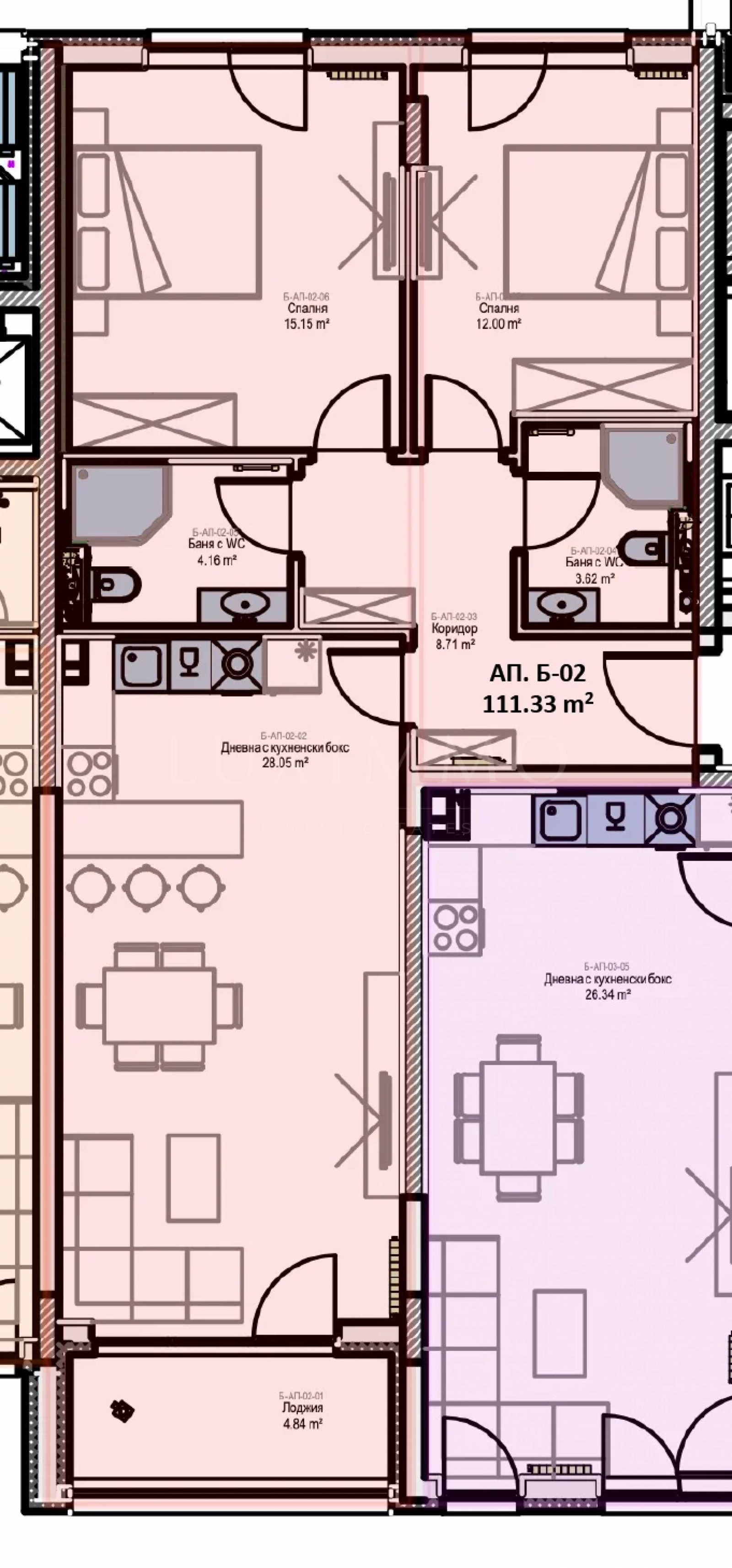 Апартаментът е разположен на 2-ри етаж и има застроена площ от 90.99 кв.м, върху която са разпределени: антре, две бани/тоалетни, дневна с кухня и трапезария, тераса, две спални. Жилището се предава в степен на завършеност по БДС, с качествена немска PVC дограма шесткамерен профил, с троен стъклопакет за висока енергийна ефективност и шумоизолация. Отоплението е с ТЕЦ, като ще са изградени медни трасета за климатици (сплит и мултисплит системи).