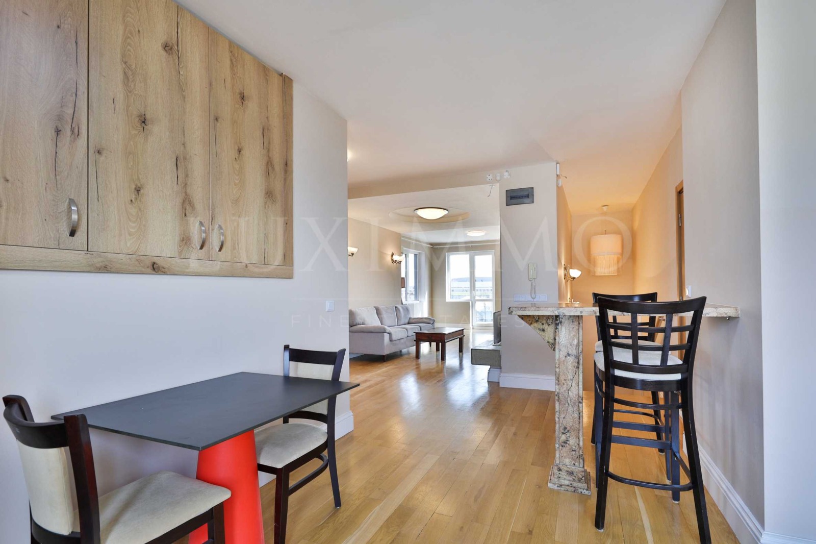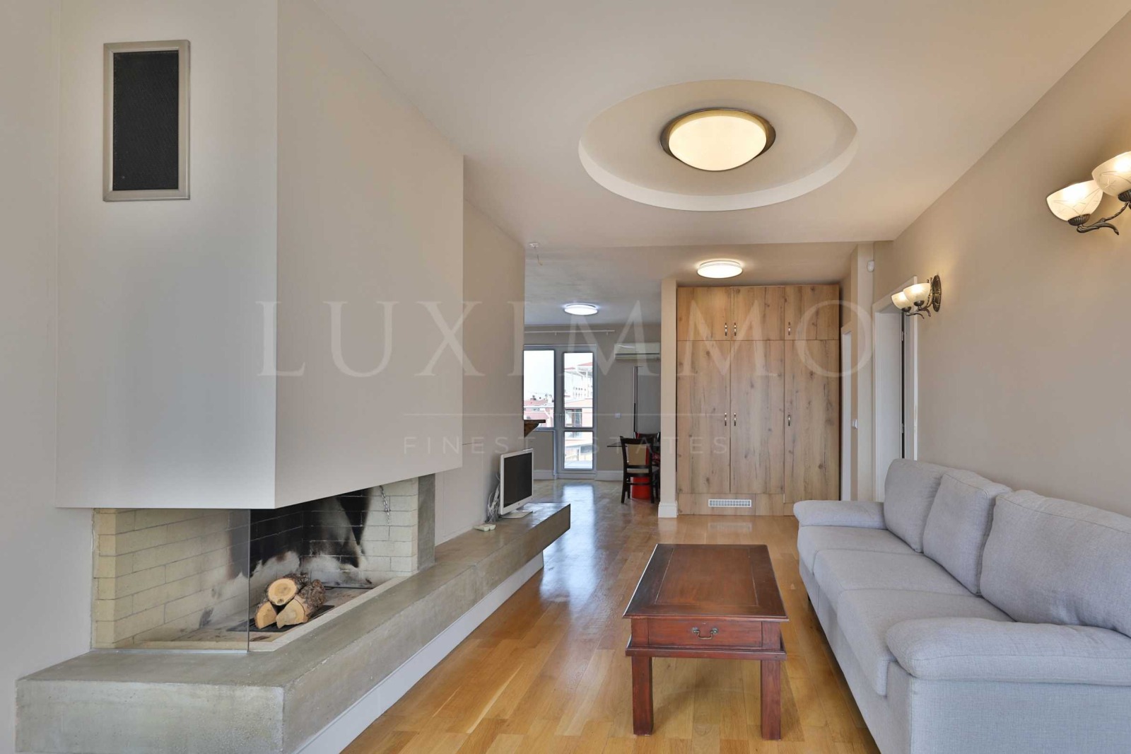 Апартаментът е напълно обзаведен и оборудван със стилни мебели и уреди. Отоплението е решено чрез климатици и камина, а подовата настилка е от естествен масивен паркет, създаващ усещане за уют и комфорт.