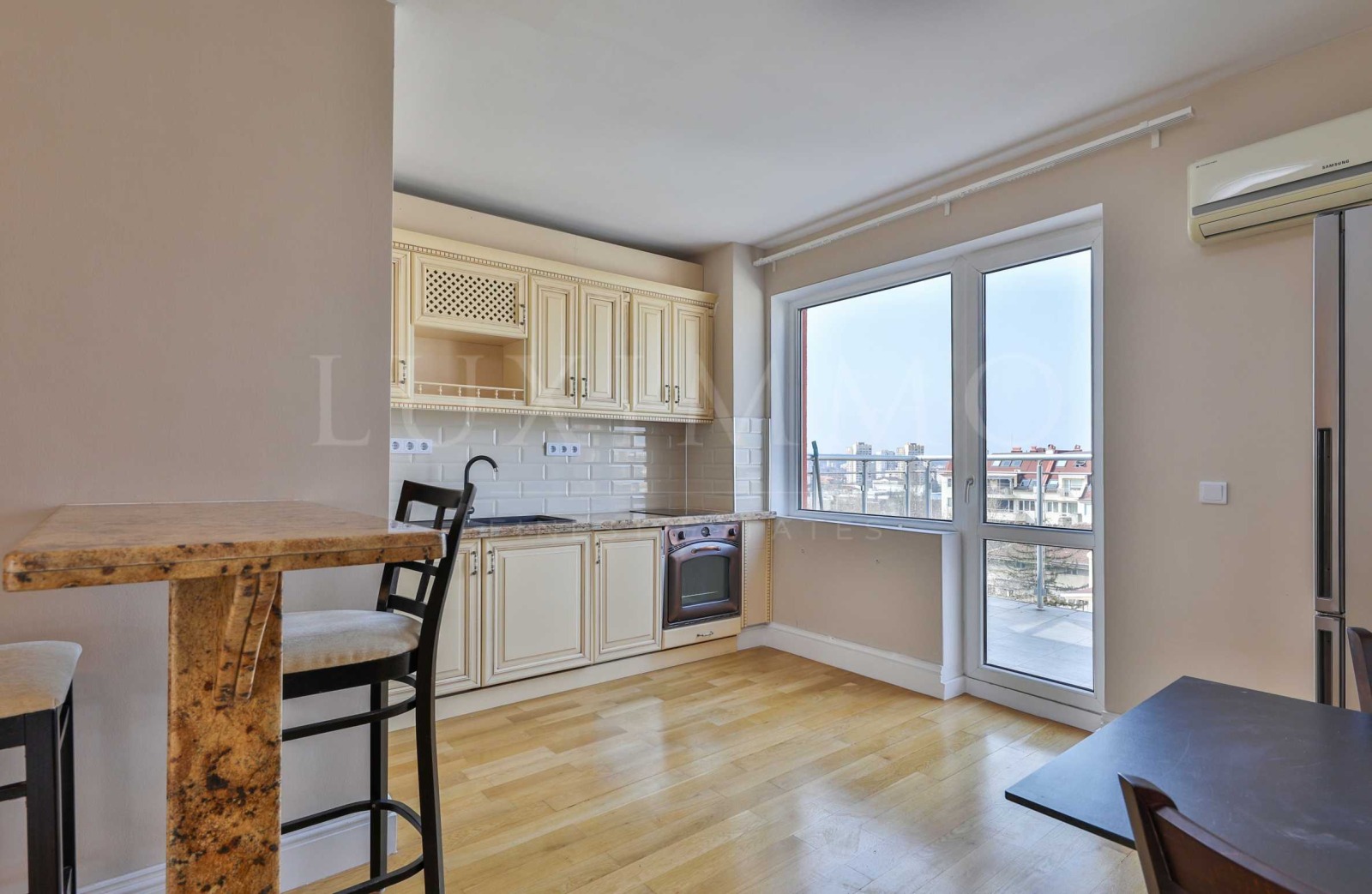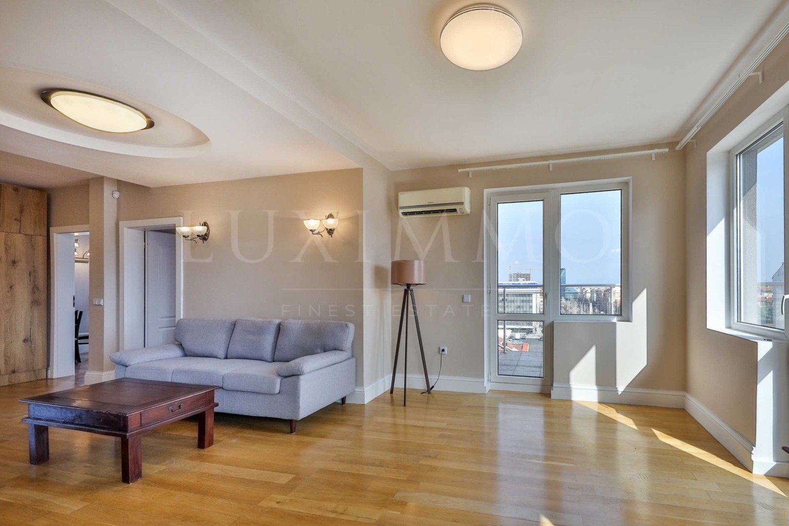 Представяме под наем изключителен тристаен апартамент, разположен на последен 7-ми етаж, с впечатляващи панорамни гледки към центъра на София и планината Витоша.