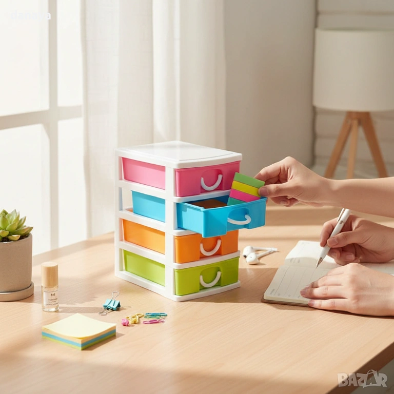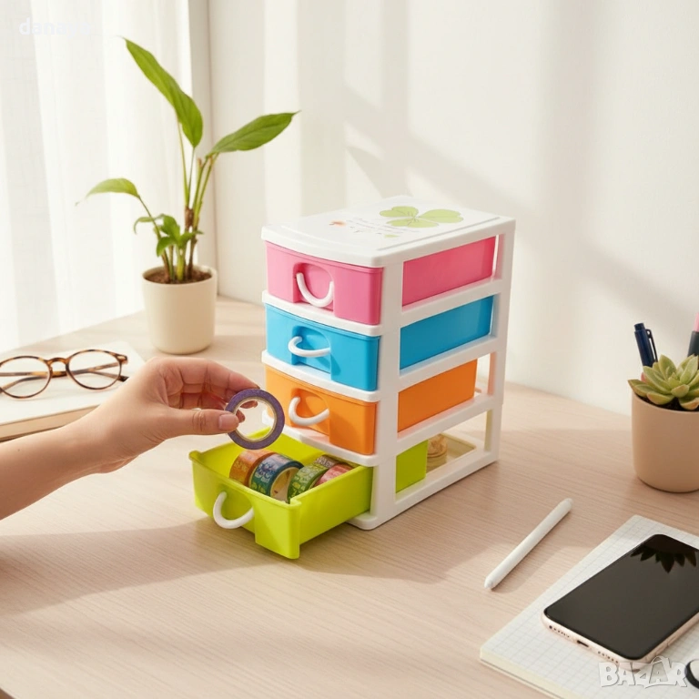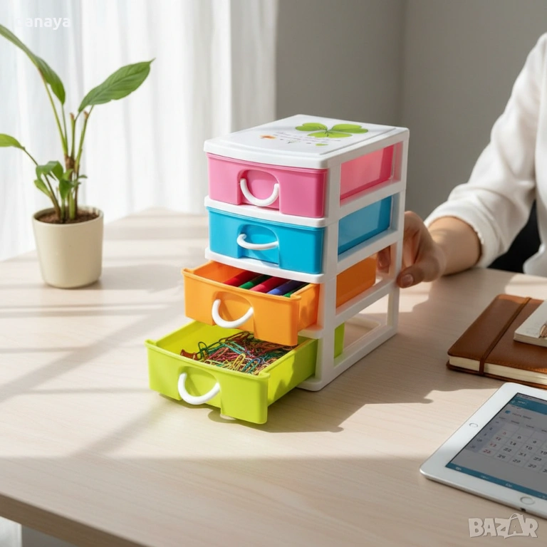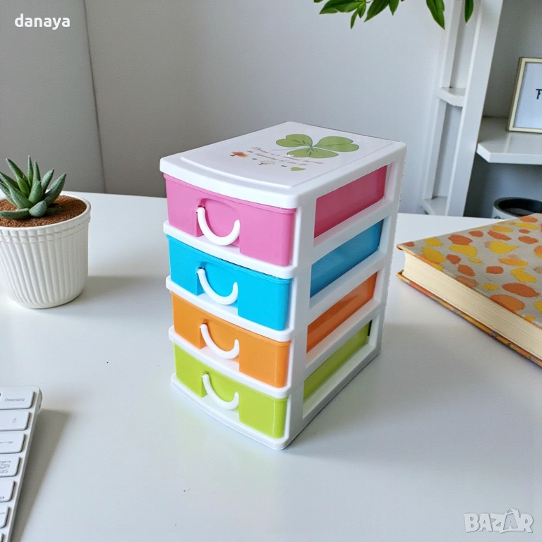 Мини шкафче с 4 чекмеджета. Този мини органайзер с 4 чекмеджета в свежи цветове е малкият помощник, който внася ред, лекота и настроение във всяко пространство. Компактен, но изненадващо практичен – идеален за бюро, тоалетка, детска стая или работен кът у дома.