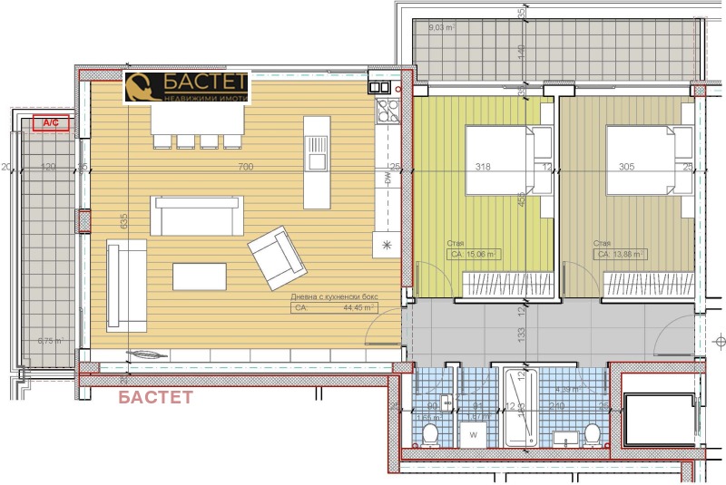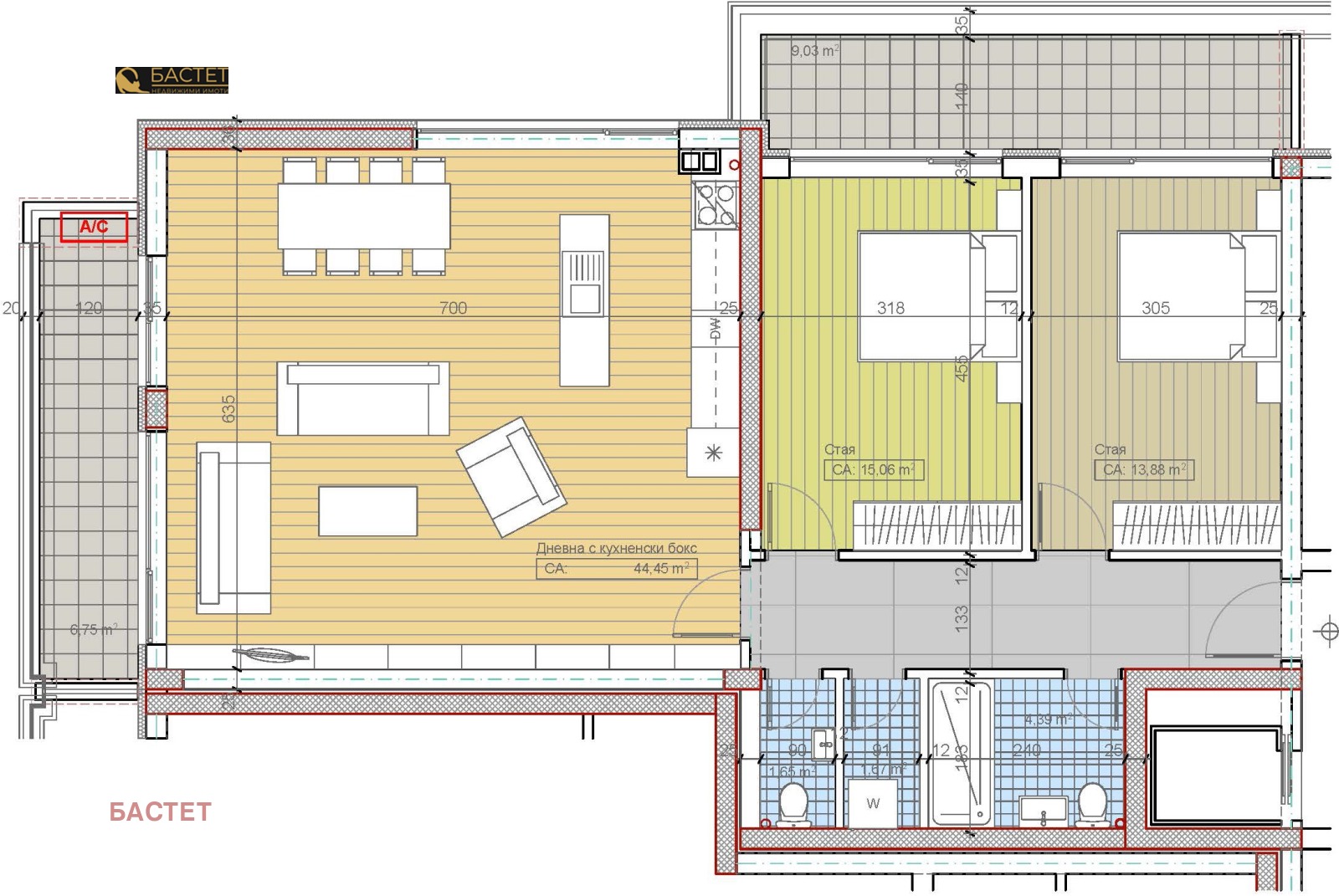 Южен тристаен апартамент със ЗП 123 кв.м, състои се от входно антре, дневна с трапезария и кухненски бокс 44.45 кв.м, две спални по 15 и 14 кв.м, баня с тоалетна,отделно тоалетна,мокро помещение, две тераси. В цената е включен склад 3.53 кв.м. Вградено подово отопление. Възможност за закупуване на гараж или паркомясто. При оглед ще ви покажем и други свободни апартаменти. Очакван Акт 16 - началото на 2026 г. Разсрочена схема на плащане. Местоположението е в местност Гърдова глава, на около 200 метра от кръстовището на бул. Цар Борис III и бул.Никола Петков и спирки на градски транспорт - трамвай 5, автобуси 111 и 260 с бърз достъп до центъра и по Околовръстен път. Недалеч е новоизградения Ритейл парк Княжево.