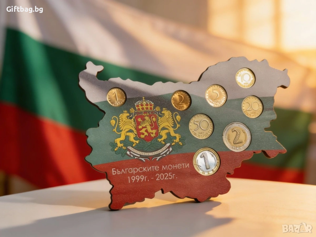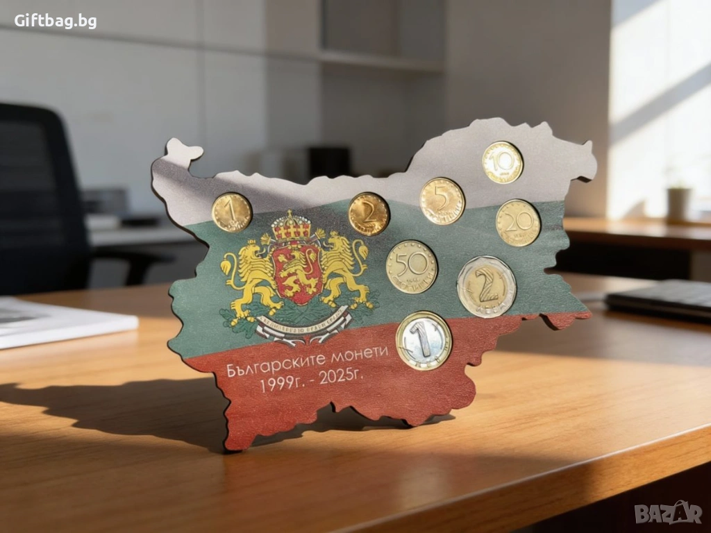 Върху силуета са предвидени прецизно изрязани места за български монети с различни
