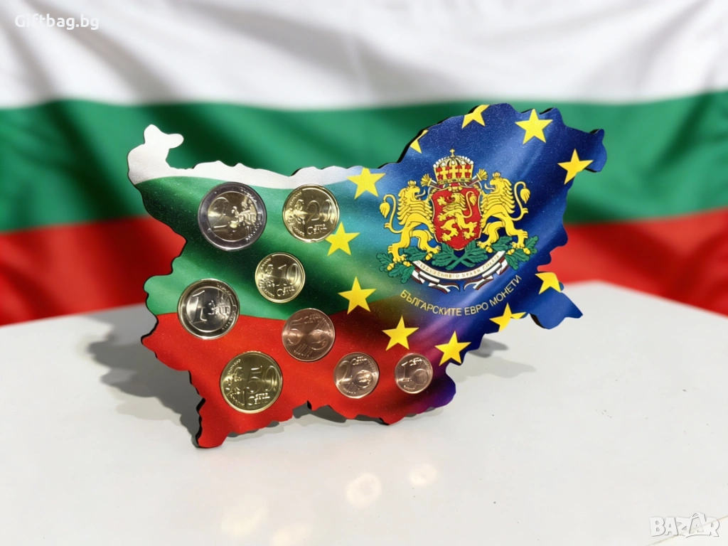 Върху силуета са предвидени прецизно изрязани позиции само за българските евро монети,