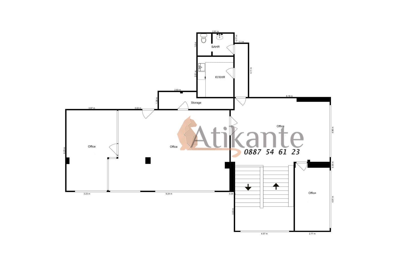 Atikante Estates presents a spacious and fully functional office for rent, located on the 1st floor of a modern business building with a separate staircase and direct access from the main entrance and reception area.