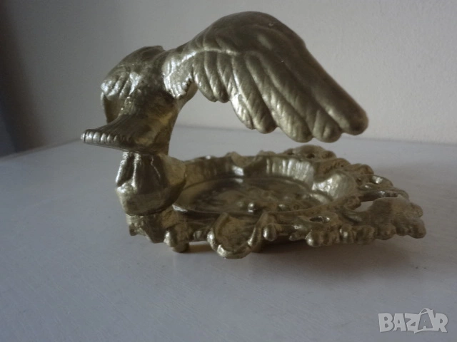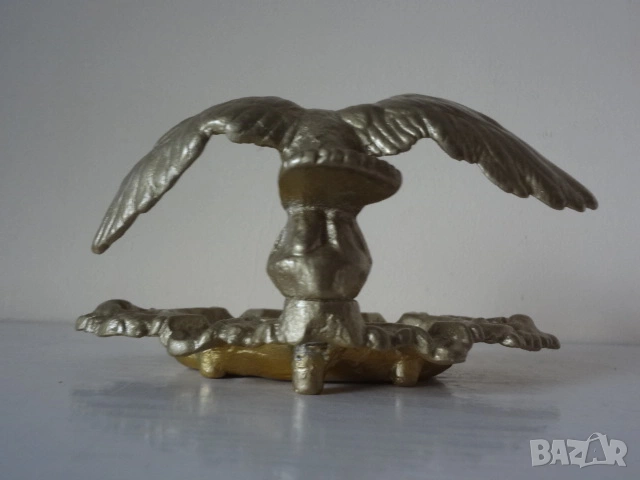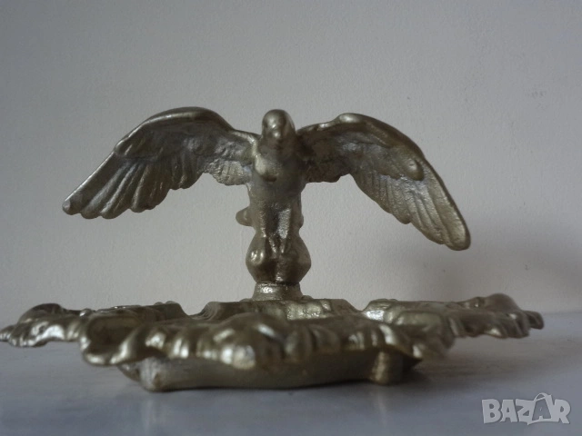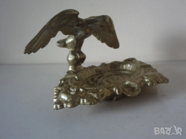 Много интересен и красив орнаментален бронзов арт пепелник. Представлява статуетка отливка на орел с разперени криле. Намира се в отлично състояние и е един различен и нестандартен аксесоар за пушачите , който ще направи впечатление на гостите и приятелите. Дължина - 18 см. ; височина - 15 см.