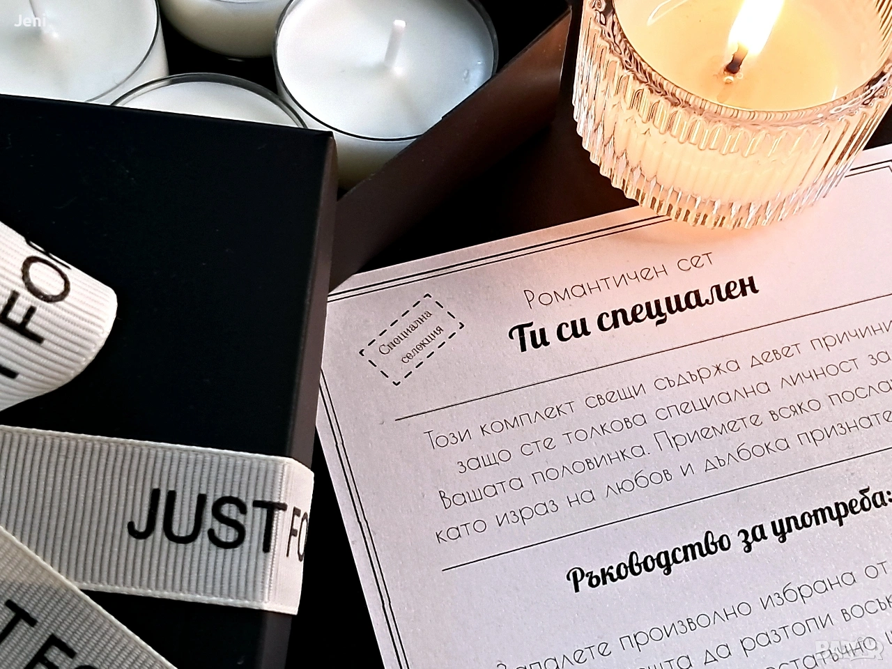 Този комплект включва 9 свещи, като всяка от тях носи специално, лично послание. Посланията са внимателно подбрани, за да изразят най-дълбоките чувства на любов и привързаност. Те разкриват причините, поради които вашата половинка е толкова важна и незаменима част от живота ви. Всяко послание е романтичен жест, който говори за любовта и благодарността, които изпитвате. Тези свещи са не просто подарък, а символ на вашата връзка и вашата уникална история заедно. Идеални за специални поводи като годишнини или Свети Валентин, те ще превърнат момента в незабравимо преживяване и ще накарат любимия човек да се почувства истински обичан и ценен. Как да използвате? Запалете свещта и създайте уютна атмосфера. Не е нужно нищо друго – просто оставете свещта да разтопи восъка си. С нагряването посланието постепенно ще се разкрие, а когато свещта достигне оптималната температура, ще прочетете с лекота написаното в нея. Забележка: Изображението на свеща в сайта е илюстративно за да покаже как се визуализира текста в свещите. Съдържание на посланията в свещите: Винаги си до мен въпреки всичко Намерих липсващата част от мен Ти си моето щастие Показа ми, че любовта съществува Заедно можем всичко Ти ме правиш по-добър човек Вярваш в мен Подкрепяш ме във всяка щуротия Обичам те дори когато ме ядосваш Защо да изберете този комплект? Лични послания, които докосват сърцето – Всяка свещ съдържа романтично послание, което изразява вашата любов и признателност по уникален начин. Подходящ за специални поводи – Идеален избор за годишнини, Свети Валентин или просто за момент, в който искате да покажете колко много значи вашата половинка за вас. Уникален и запомнящ се подарък – Комплектът не е просто поредният подарък, а израз на вашата индивидуалност и специалната връзка, която споделяте. Романтично преживяване – Освен че са красиви, свещите създават топла и романтична атмосфера, която ще направи момента още по-специален. Символ на любовта – Всяка свещ е жест на внимание, показвайки грижа и желание да направите любимия човек щастлив. Практичен, но емоционален подарък – Свещите са както практичен подарък, така и носител на дълбока емоция, което ги прави перфектни за всяка връзка. Този сет свещи е подходящ за: Партньори в романтични връзки – За хора, които искат да изразят своята любов, подкрепа и благодарност към половинката си. Сетът е идеален за специални моменти като годишнини, валентински дни или просто за напомняне на любимия човек за тяхната важност. Лица в дълготрайни и силни връзки – За тези, които са преминали през различни етапи на взаимоотношенията си и искат да подчертаят значението на доверието и безусловната любов. Хора, които ценят личната подкрепа и взаимно израстване – Свещите носят послания за това как любовта и подкрепата могат да вдъхновят личностното развитие и да направят човека по-добър. За тези, които вярват в любовта и нейната сила – Ако искаш да поднесеш нещо специално на любимия човек, което символизира вечната привързаност и вярност. Подарък за важен момент в отношенията – Независимо дали става дума за ново начало, период на съвместен живот или преодоляване на трудности, този сет свещи е чудесен начин да покажеш обич и благодарност. Всеки, който обича да създава романтични моменти – За тези, които обичат да добавят топлина и е