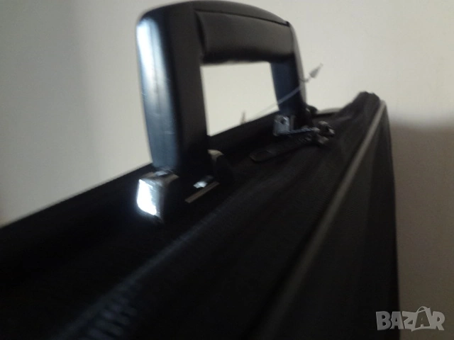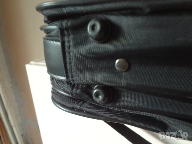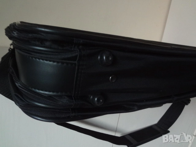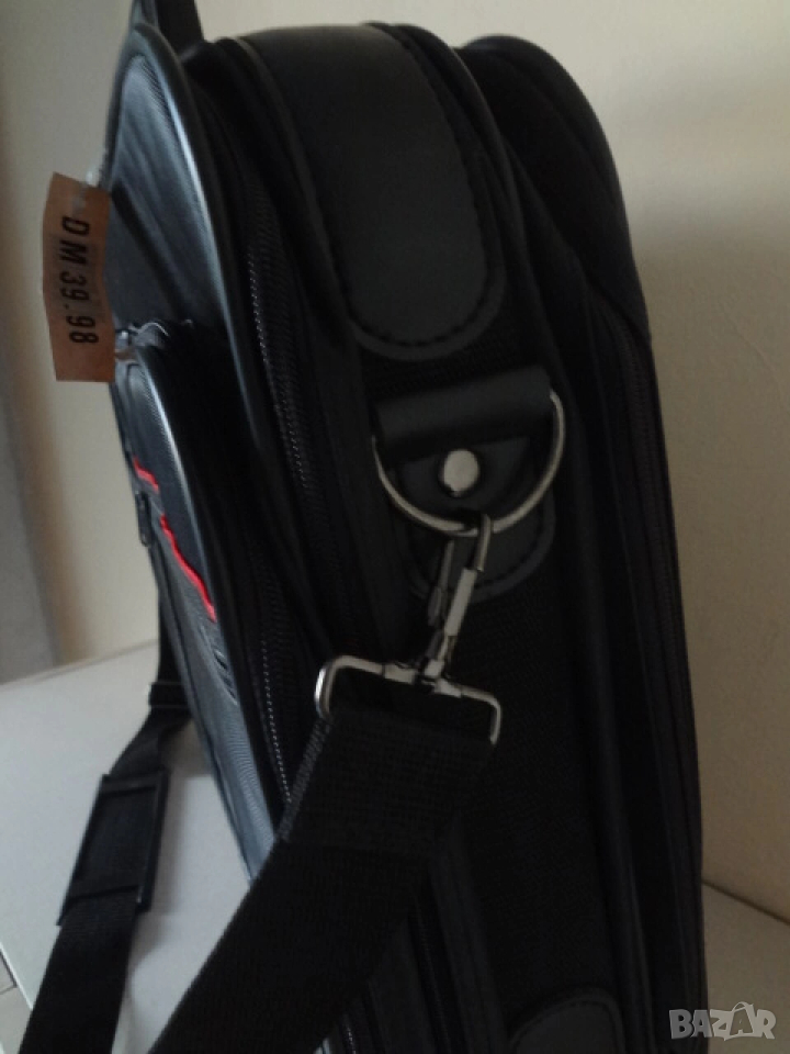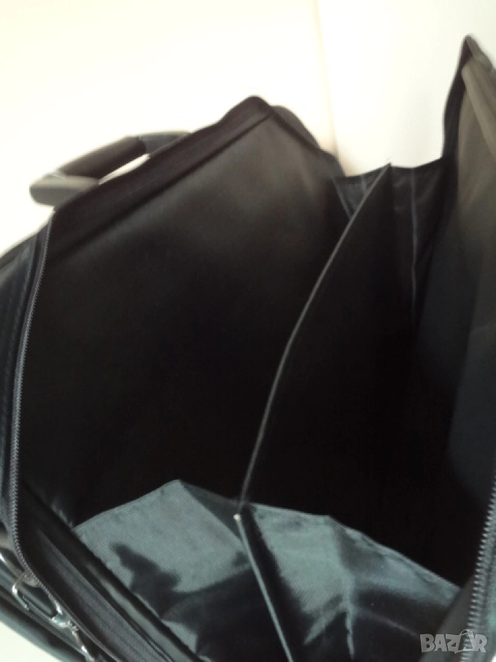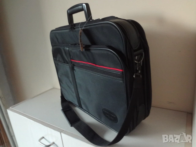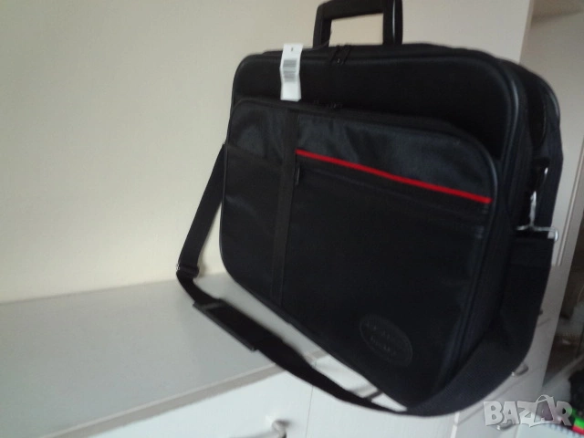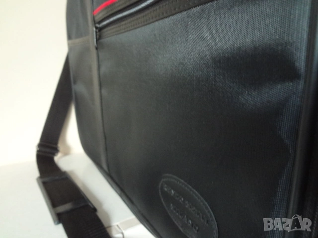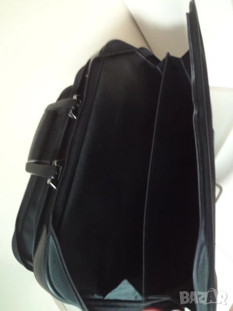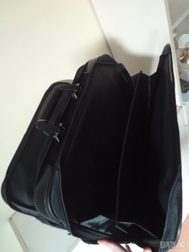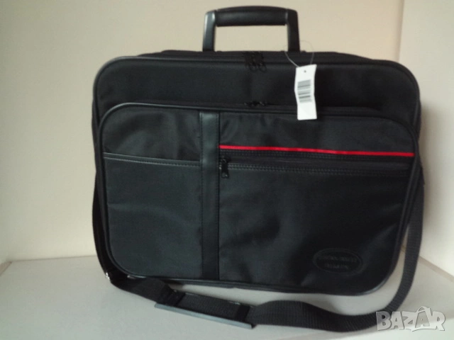 Чисто нова италианска бизнес чанта за лаптоп компютър и документи. Чантата е с етикета си както е закупена и никога не е ползвана. Изработена е от непромокаем лъскав материал. Има 3 отделения - едното доста широко , другото по-тясно с прегради за документи и голям джоб отпред. Дръжката е пластмасова- масивна и здрава. Има си и колан за през рамо. Дължина - 50 см.; височина - 45 см.; ширина - 12 см. в събрано състояние.