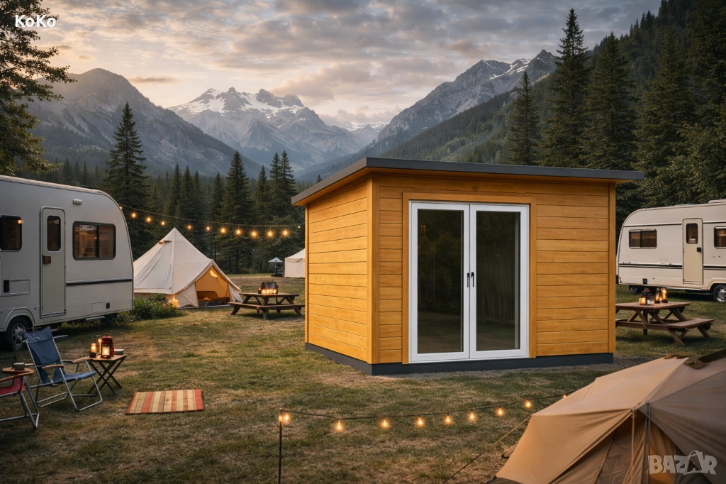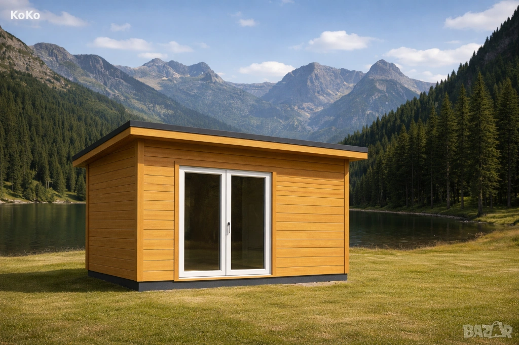 Изолирано, напълно завършено дървено бунгало с баня и WC, предназначено за целогодишна употреба. Подходящо за офис, рецепция, персонално помещение или обслужваща сграда в къмпинги, глемпинг зони и туристически комплекси.