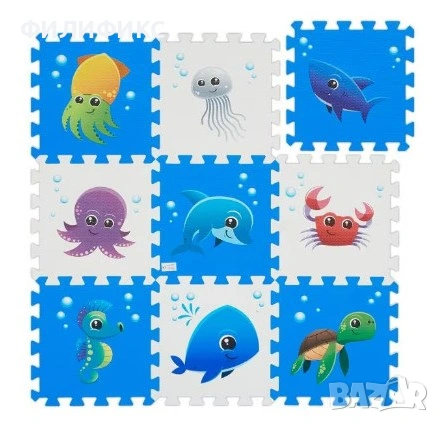 Продавам нов детски килим пъзел с морски животни, състоящ се от 9 меки EVA части с размер 32×32 см всяка. Перфектен избор за детска стая, бебешка стая или кът за игра, осигуряващ комфорт, безопасност и забавление.