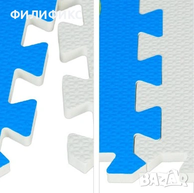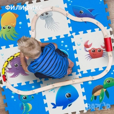 Килимът е изработен от мек и изолиран EVA материал, който предпазва детето от студения под и омекотява при падане. Цветните морски животни стимулират въображението, фината моторика и зрителното развитие на детето. Частите могат да се подреждат в различни форми или да се използват като отделни елементи за игра.