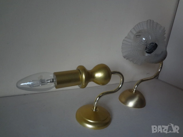 Комплект от 2 броя лампи за стена - аплици в златист цвят. И двата са различни модели и могат да се поставят в отделни помещения. Тествани са и работят идеално. Високи са по 20 см. Цената е за двата броя , но се продават и по отделно.