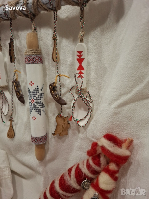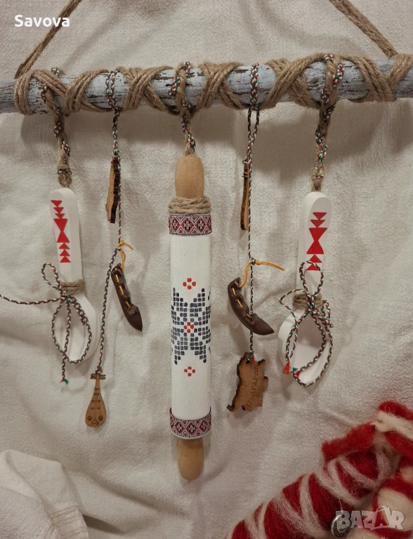 Материали: ръчно изработени керамични лъжички с изрисувани сакрални символи Канатица, дървена точилка, ръчно изрисувана със символ Елбетица, ширити с шевица и трикольор, кожени и дървени елементи за декорация