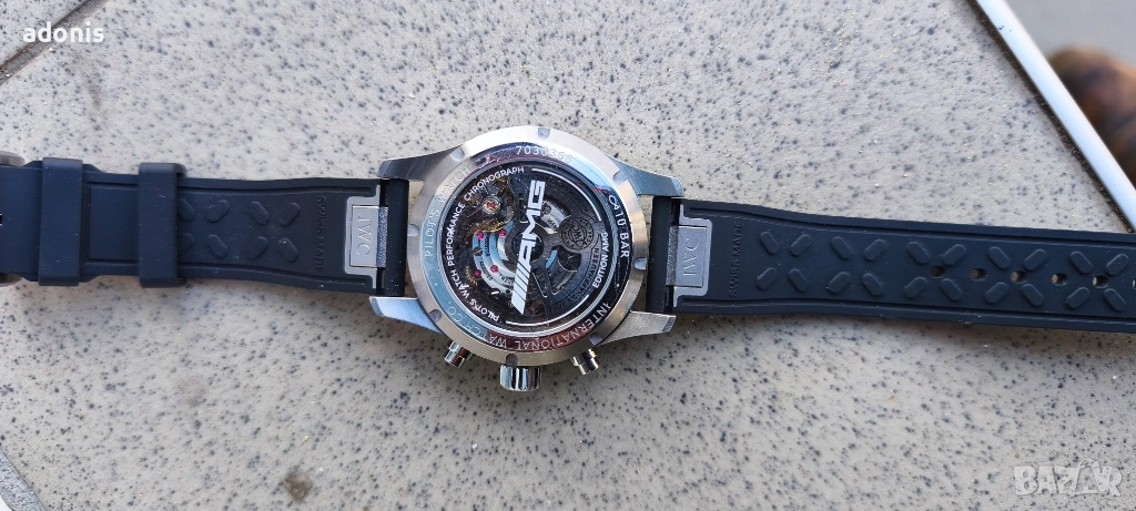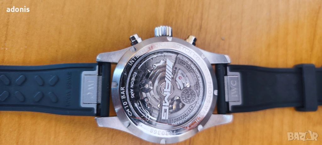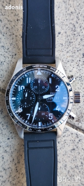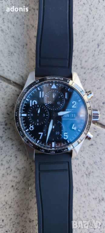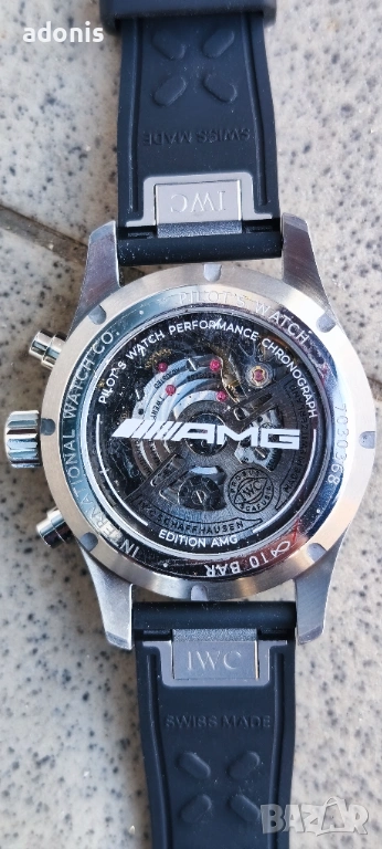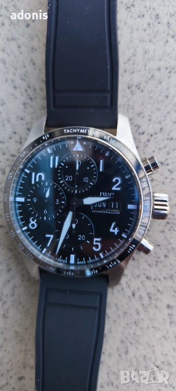IWC Shaufhaussen Pilot's Watch Chronograph 41 AMG automatic mechanical watch Eta Valjoux 7750 movt. ИВЦ пилотски автоматичен механичен хронографен часовник Ей Ем Джи с Ета Валжу 7750 автоматично хронографно движение. Часовника е чисто нов с предпазното найлонче на прозрачния заден капак. В перфектно визуално и функционално състояние. Показания час, ден, дата , 12 часов хронограф , автомат с възможност и за ръчно навиване. Най- високо качество . С оригиналната си подвижна каишка с пластини с брандирани бутони. С всички необходими обозначения и брандировки. Уникален, екстравагантен и луксозен. Невероятен. Реални снимки. Стил, качество и лукс на високо ниво.
