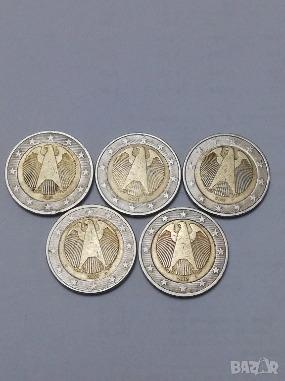 циркулирали 5 монети пълен лот от 2 евро Германия 2002 г. букви A;D;F;G;J тези монети се секат в 5 различни монетни двора и съответно имат различни букви A;D;F;G;J.цена за лота 25 евро.изпращам само по еконт.