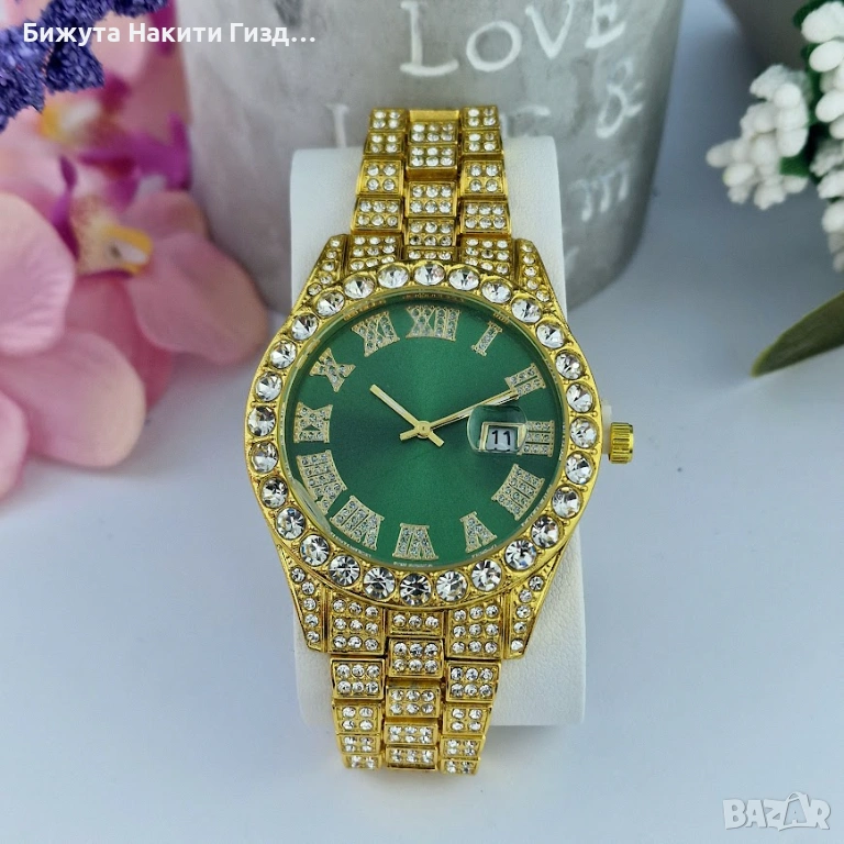 Златист корпус в комбинация с наситен цветен циферблат и богато инкрустирани кристали по корпуса и верижката. Дизайнът е масивен и впечатляващ – стои като бижу на ръката и веднага привлича внимание. Цветният циферблат придава индивидуалност и характер, без да губи усещането за лукс.