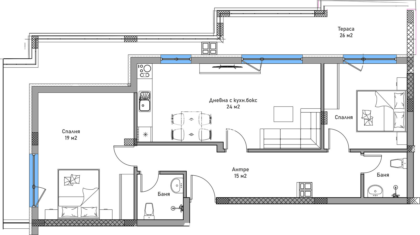 Оферта 68462 - Предлагаме Ви просторен тристаен апартамент в един от новите ни жилищни комплекси със собствен стил с изчистена и модерна визия, проектиран с нисък процент общи части, така че да създаде максимален комфорт и уют за живеене. Проектът предвижда комплексно застрояване, просторни и панорамни жилища, голям вътрешен двор с оформен детски кът и зелени зони за релакс и почивка. Жилището се състои от дневна 24кв.м. с трапезария и кухненски бокс, две самостоятелни спални, две бани с тоалетна, широко входно антре, килер и една разкошна тераса 27кв.м. Сградата е разположена в район с развита инфраструктура в близост до главен булевард с удобен транспорт към централна градска част, училища, детска градина, детска ясла и голям хранителен хипермаркет. Изпълнението ще се осъществява с висококачествени материали и съвременни технологии, по европейски стандарт, шесткамерна PVC дограма троен стъклопакет, блиндирана входна врата с 4-странно заключване, сензорно осветление, хидравлични асансьори с огледална кабина !!! Проектирането е съобразено така че да създаде максимален комфорт и функционалност, като първия акцент са елегантните общи части, широки входни антрета с красив дизайн, които да носи удоволствие. Предвидена е звукоизлолация по пода за максимален комфорт и ограничаване на въздействието на шума върху обитателите на сградата. Паркирането е решено с външни и подземни паркоместа, както и с партерни гаражи. Гъвкави схеми на разсрочено плащане в рамките на строителството, както и съдействие за банково кредитиране с изключително изгодни условия за клиенти на агенция Кондор.