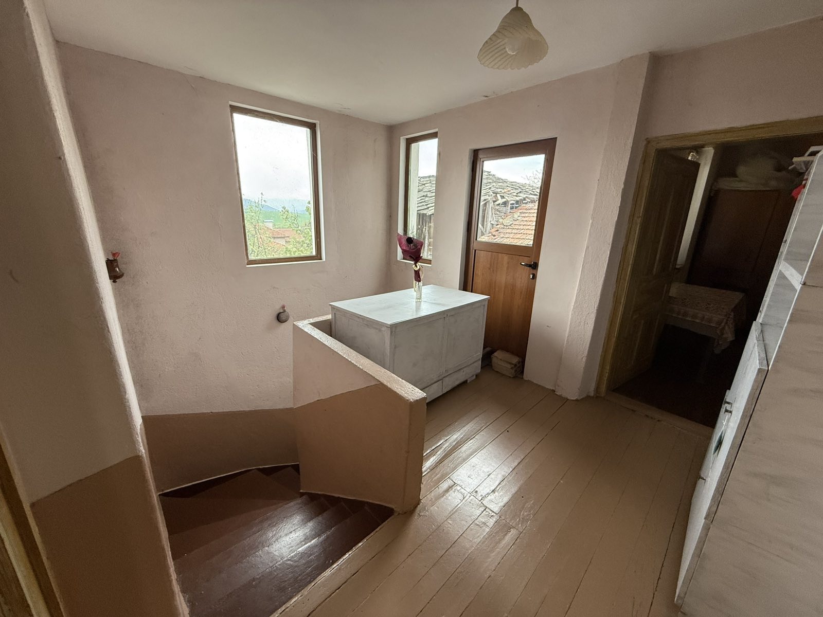 1-ви етаж Стълбище,голяма кухня,баня с тоалетна и маза.