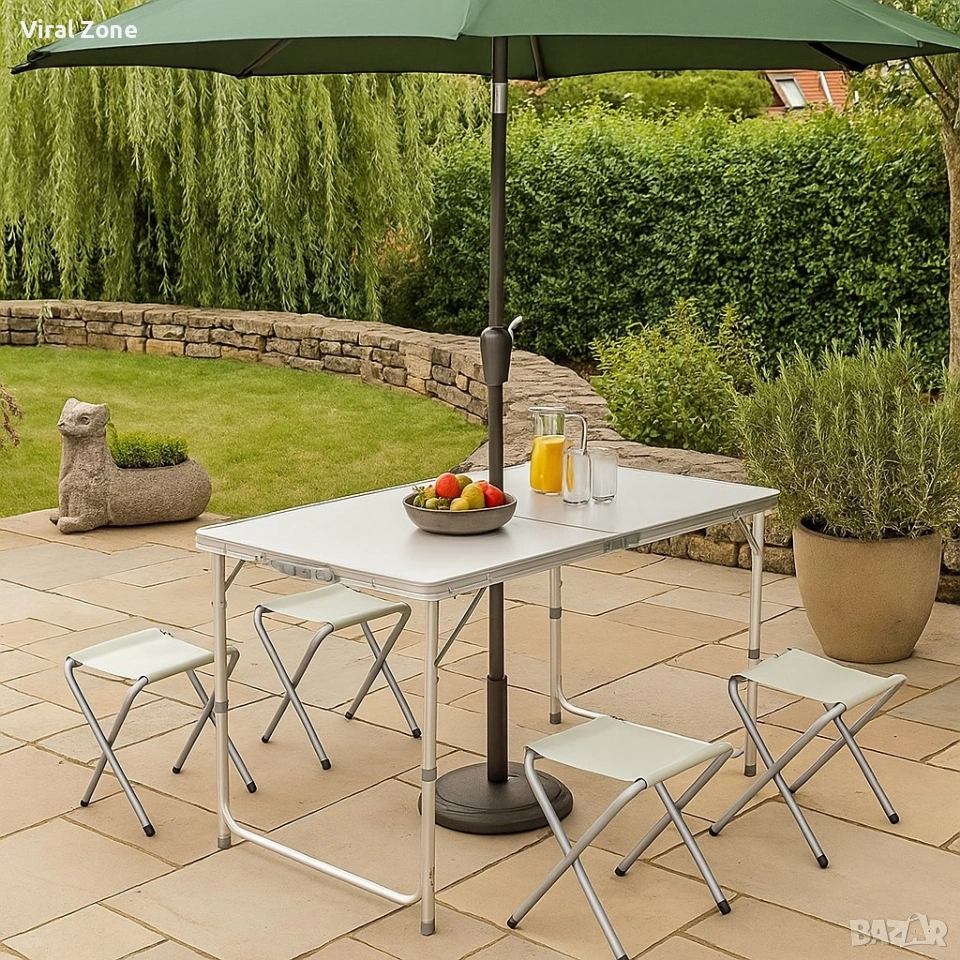 Комплект сгъваема алуминиева маса с 4 стола – идеален за къмпинг, двор и почивка