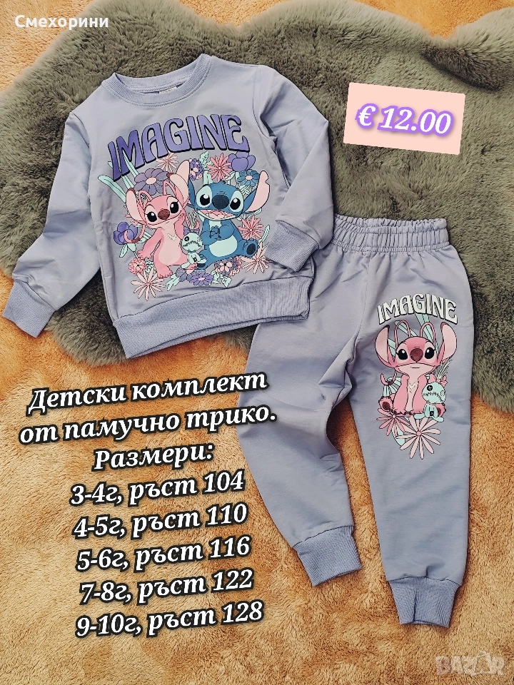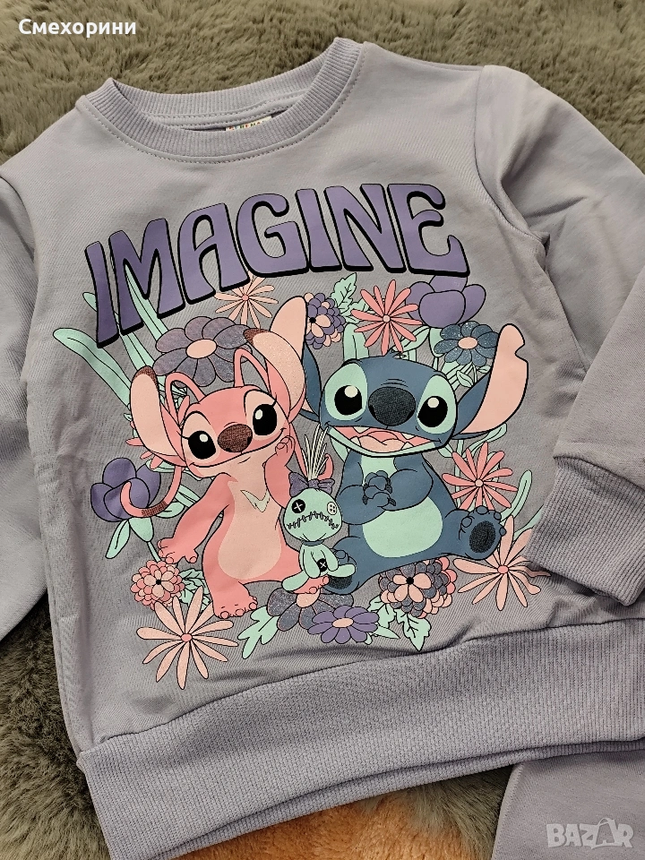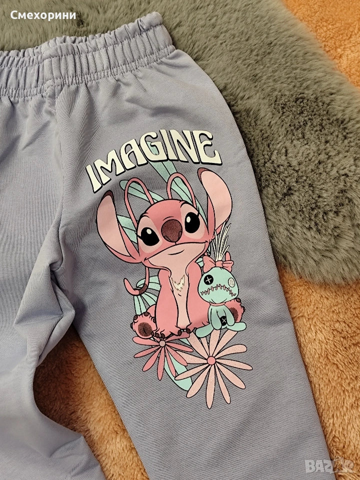 Нов детски памучен комплект от три части със Стичи, за момиченца. Наличен в размери 104, 110, 116, 122, 128см