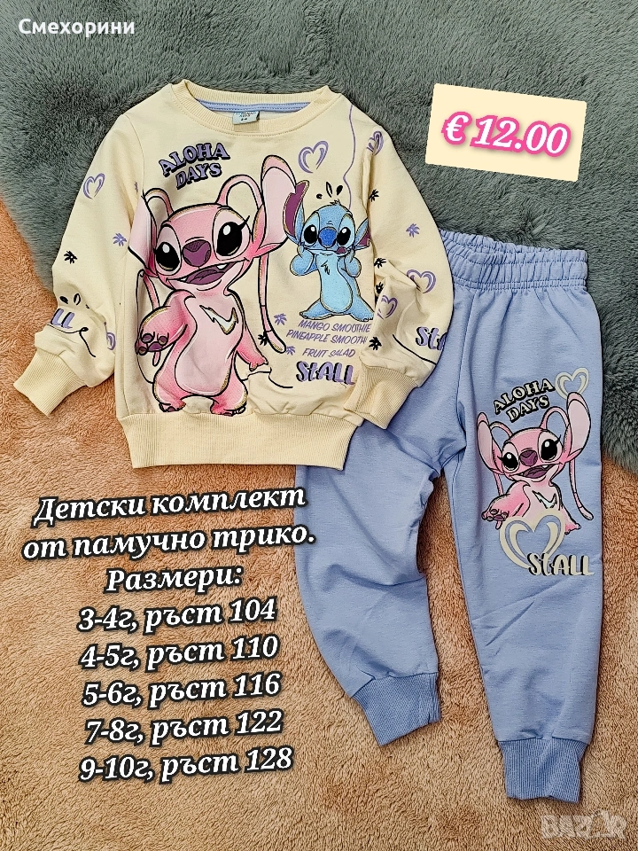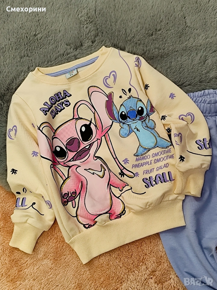 Нов детски памучен комплект от три части със Стичи, за момиченца. Наличен в размери 104, 110, 116, 122, 128см
