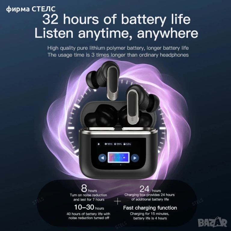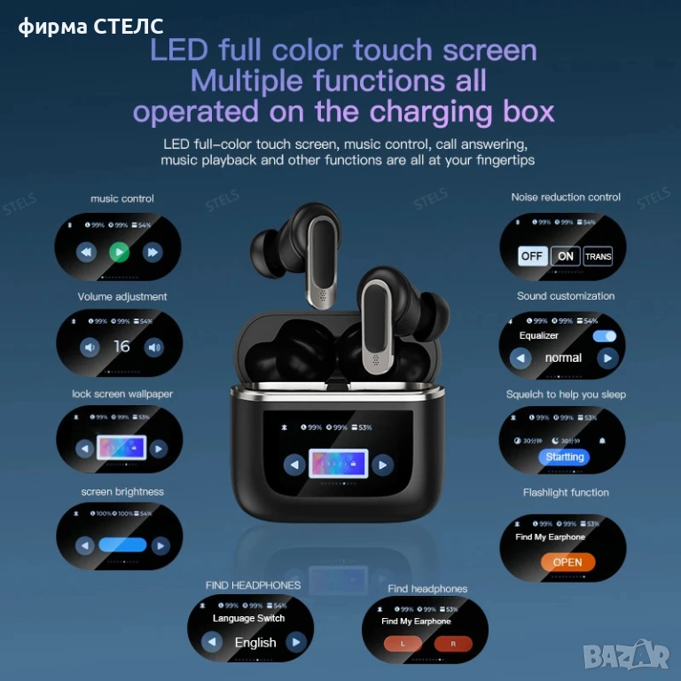 Представяме ви новите безжични слушалки STELS V8 – иновация, която променя начина, по който слушате музика. Този модел се отличава с уникална смарт кутия за зареждане, оборудвана с пълноцветен LCD тъчскрийн. Чрез дисплея получавате пълен контрол върху функциите, без да се налага да вадите телефона си от джоба.
