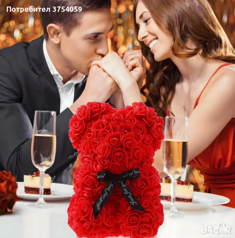 Плюшено мече с LED рози - подарък за мама, момиче, баба - комплект вечни рози 25 см