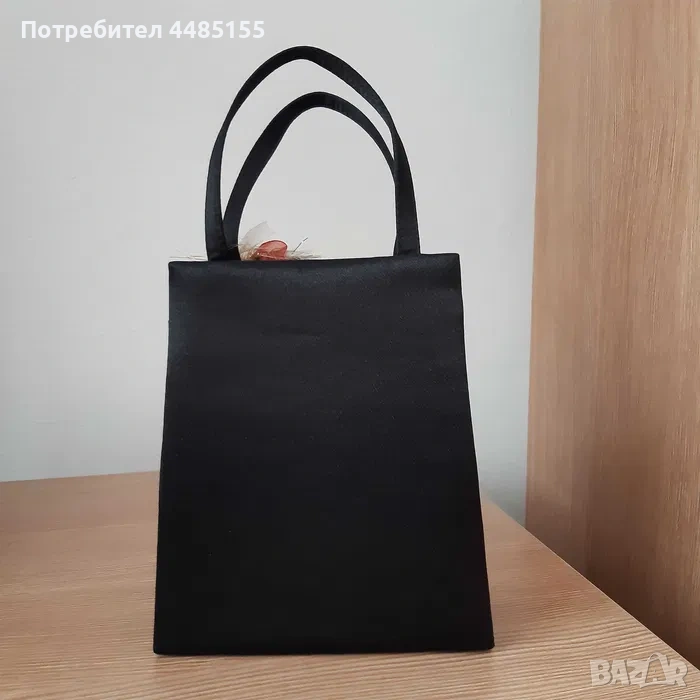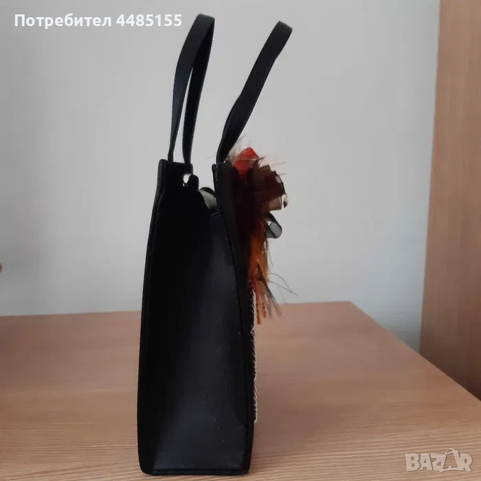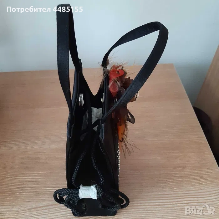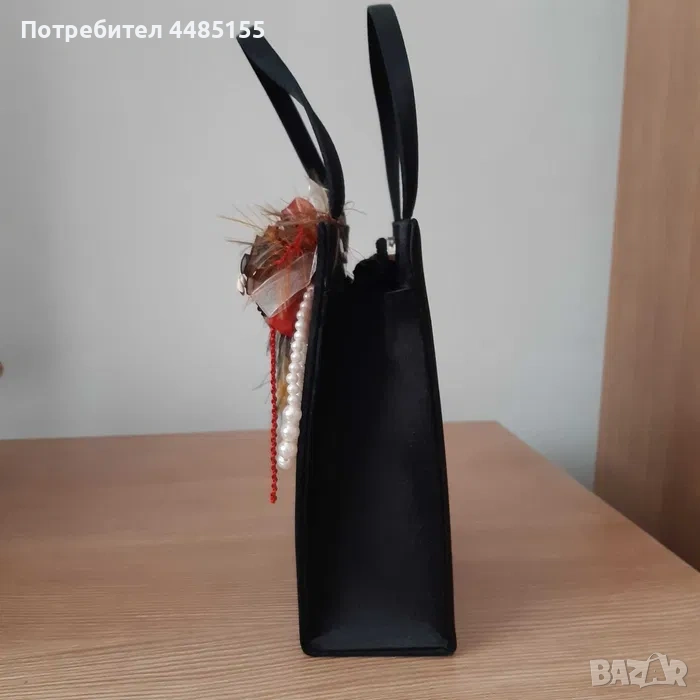 Нова, (ве)черна, интересно украсена малка чанта за официален повод. Отвътре е едно цяло пространство за най-необходимите дамски неща, има малко джобче на едната вътрешна стена. Чантата се затваря с магнитно копче. Има и дълъг черен шнур за носене през рамото.