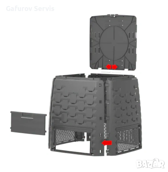 Вентилационната система със странични и долни отвори поддържа оптимални условия за разграждане на органичните материали, като предотвратява натрупването на излишна влага и неприятни миризми. За допълнително удобство компостерът разполага с голям капак с ветроустойчиво резе и просторна врата за лесен достъп до готовия компост.