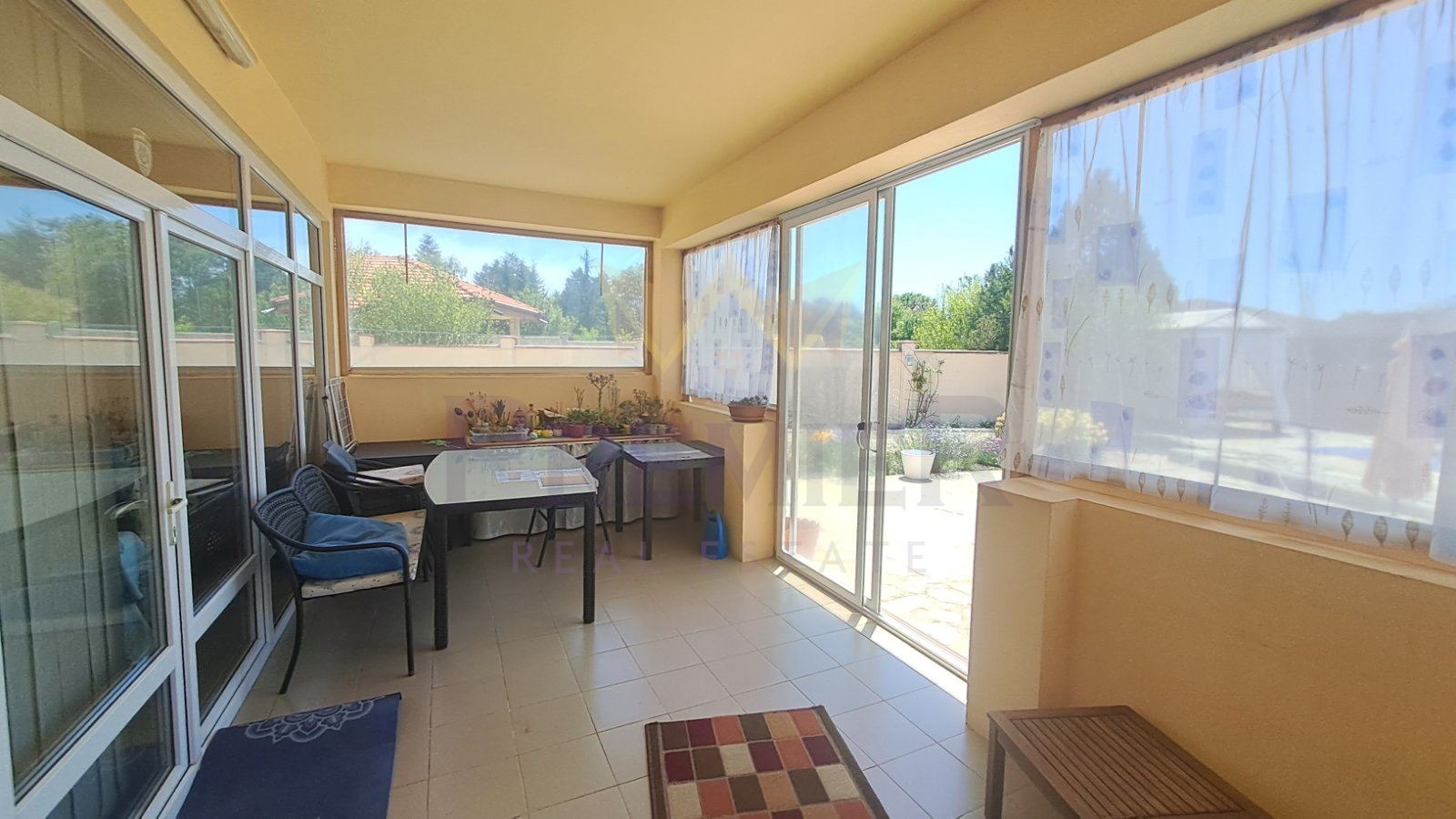 Къщата е със застроена площ от 186 кв.м.и се състои от всекидневна с кухня и трапезна зона с излаз на просторна закрита ведранда, коридор, 3 спални, перално помещение,килер,гардеробна към една от спалните, 2 комбинирани санитарни помещения, втора по малка веранда ,обособена като лятна кухня. Къщата се продава с наличното обзавеждане и оборудване, напълно готова за нанасяне.