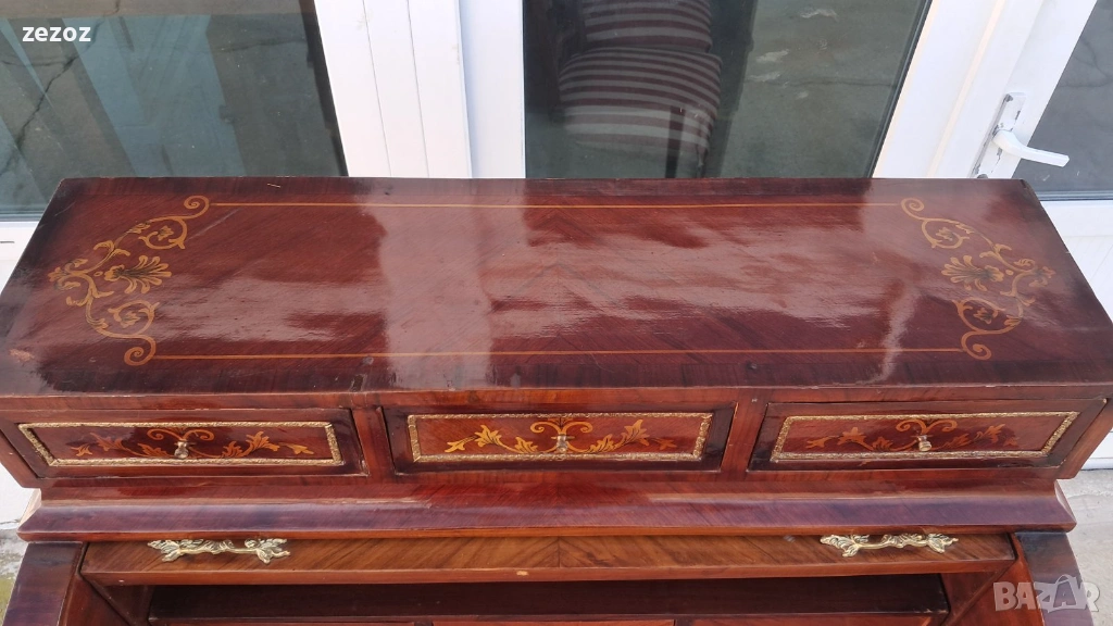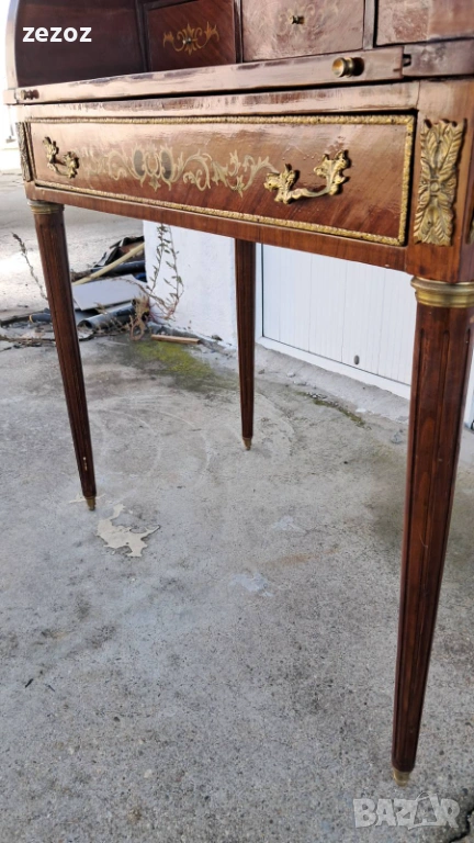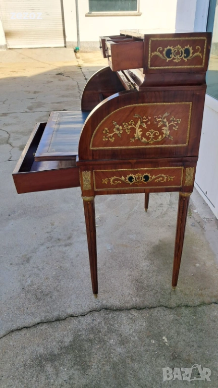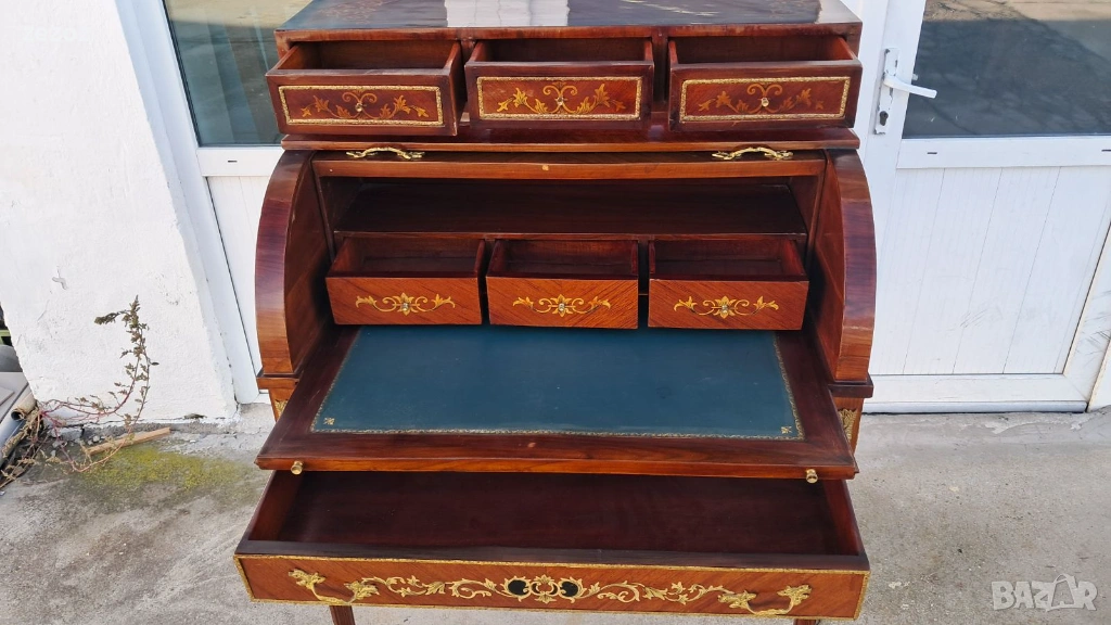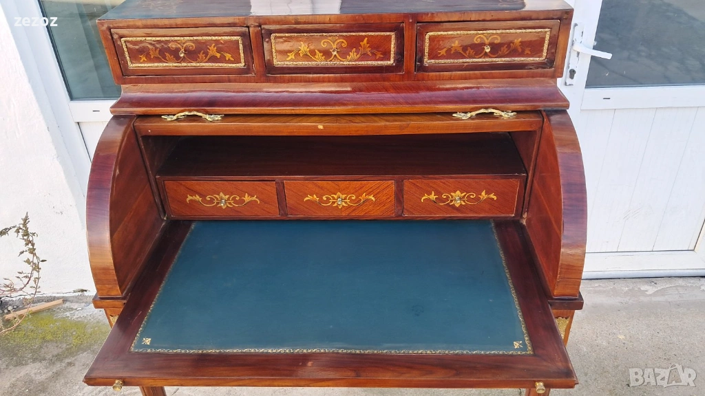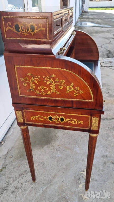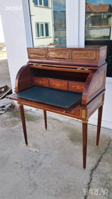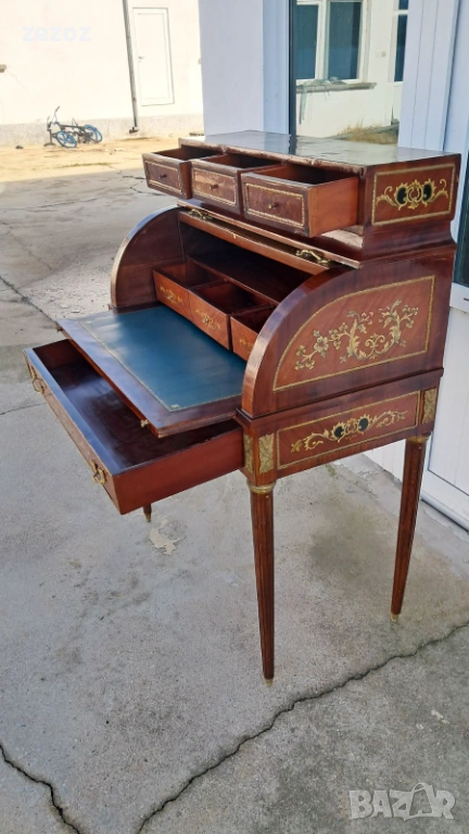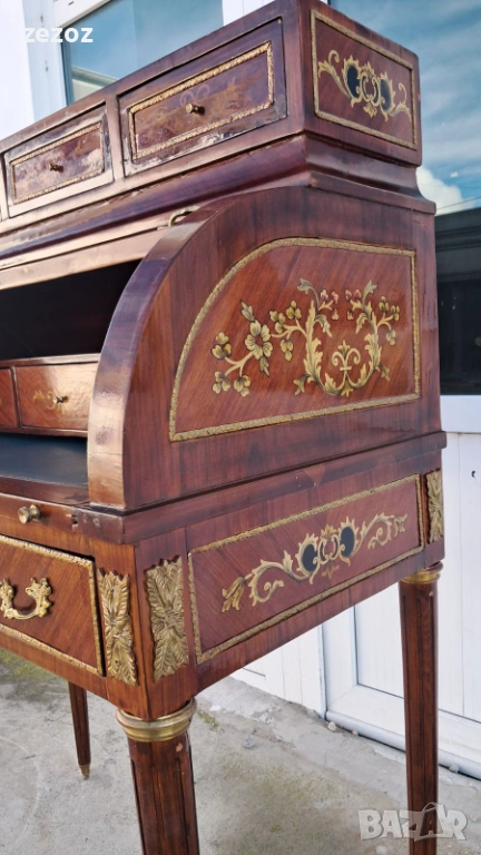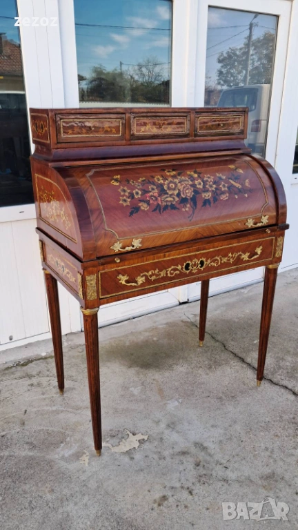 Бюрото е с цилиндричен капак,който се отваря и разкрива вътрешно работно пространство с издърпващ се плот покрит с кожа.Елегантни високи заострени крака завършващи с бронзови накрайници"обувки".Изящна декорация на цветни мотиви.За годините си писалището е конструктивно здраво и с добър външен ретро вид.Само лично предаване след оглед.Размери-