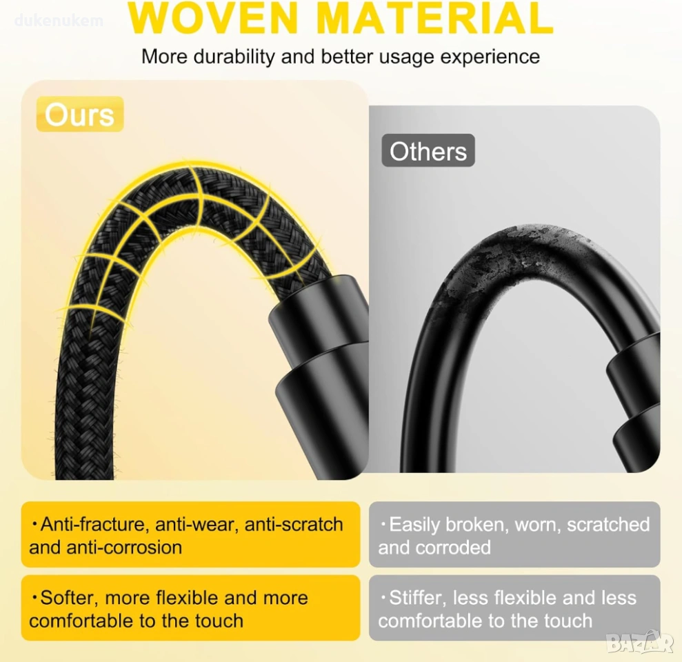 Издръжлив найлонов кабел – по-висока устойчивост на прегъване, опън и износване спрямо стандартните PVC кабели