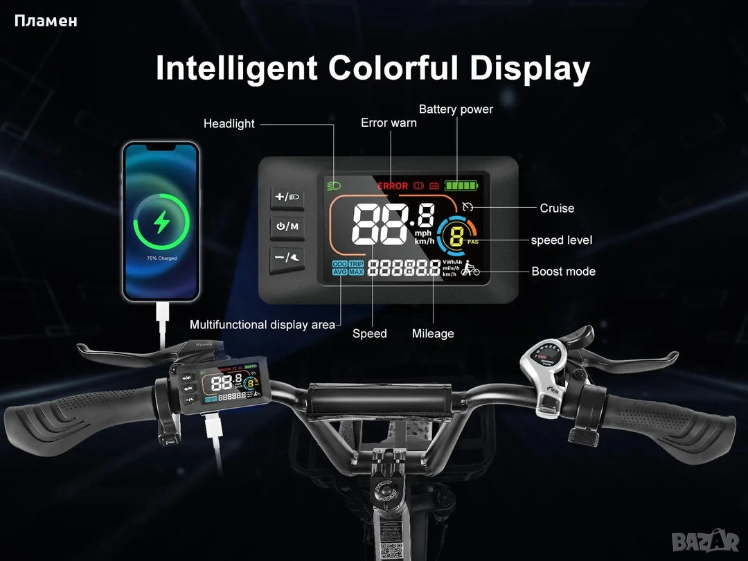 Три режима на скоростта - Велосипед - Подпомагане - Изцяло електрически