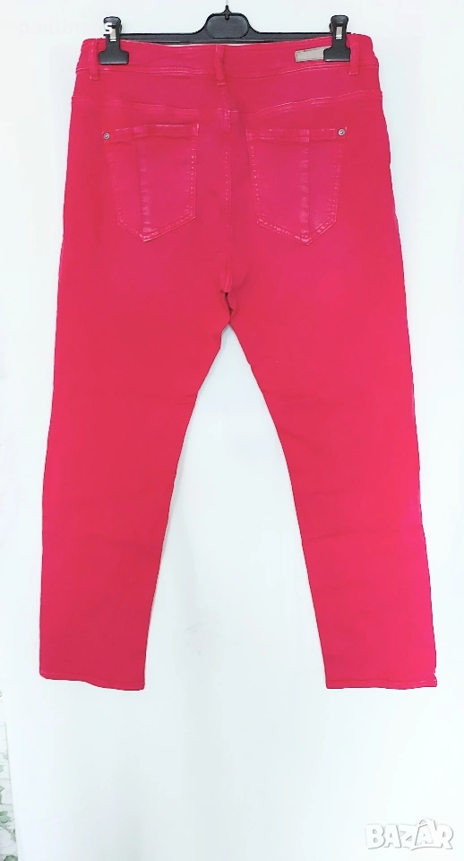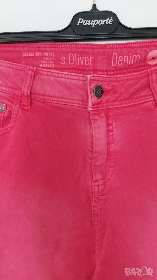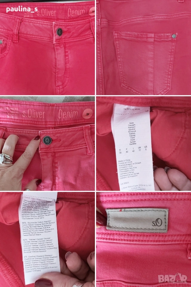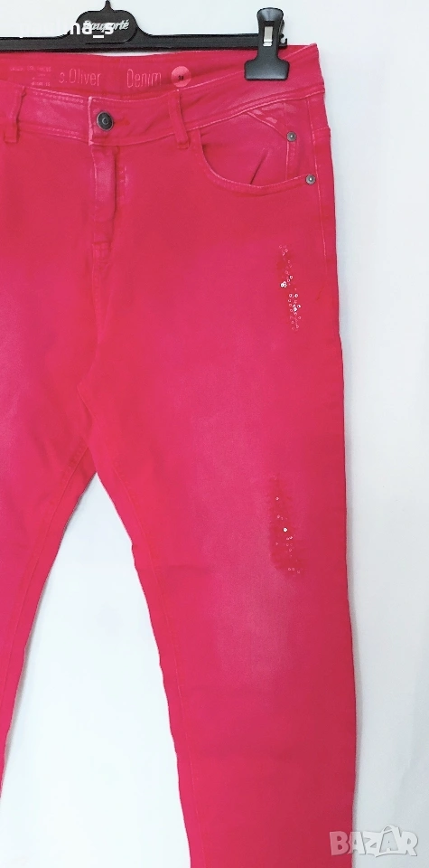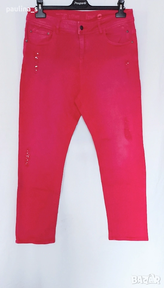 1️⃣. M / 2XL - "S'Oliver". Цената е крайна, без пазарлъци 30 евро. Уникални малинени дънки модел - гърлфренд, луузфит, скини лег, среден избелващ ефект, накъсаните частици са с пайети. Уникални са! Една бройка, много еластични, покриват посочените размери, нови са, без етикет.