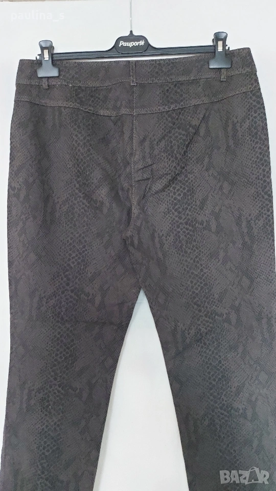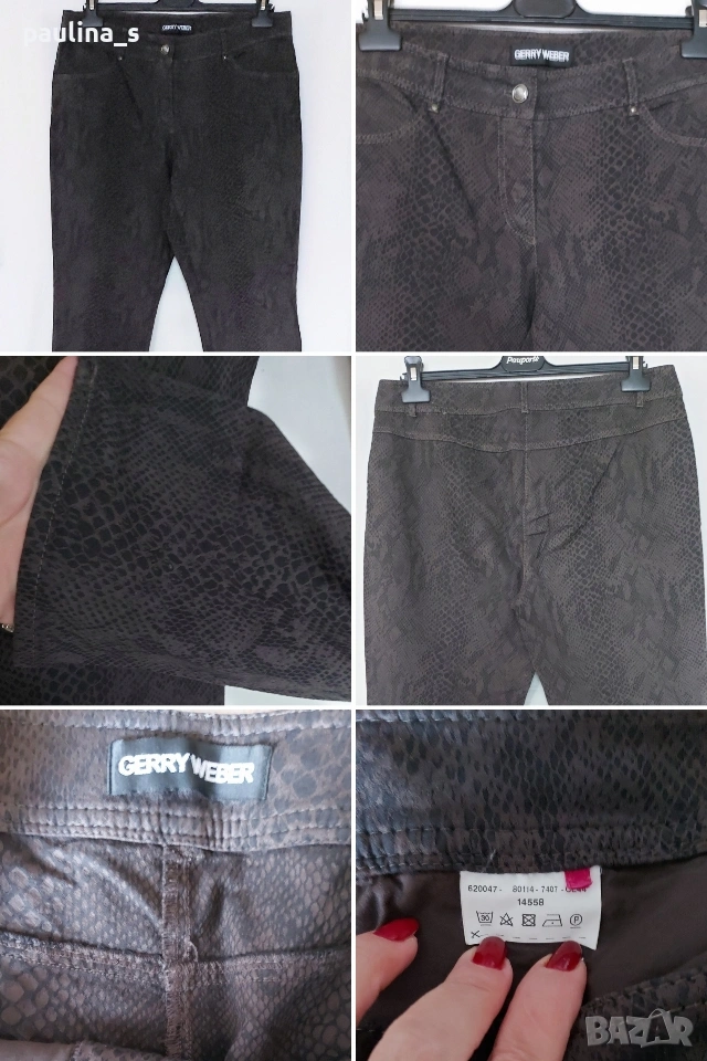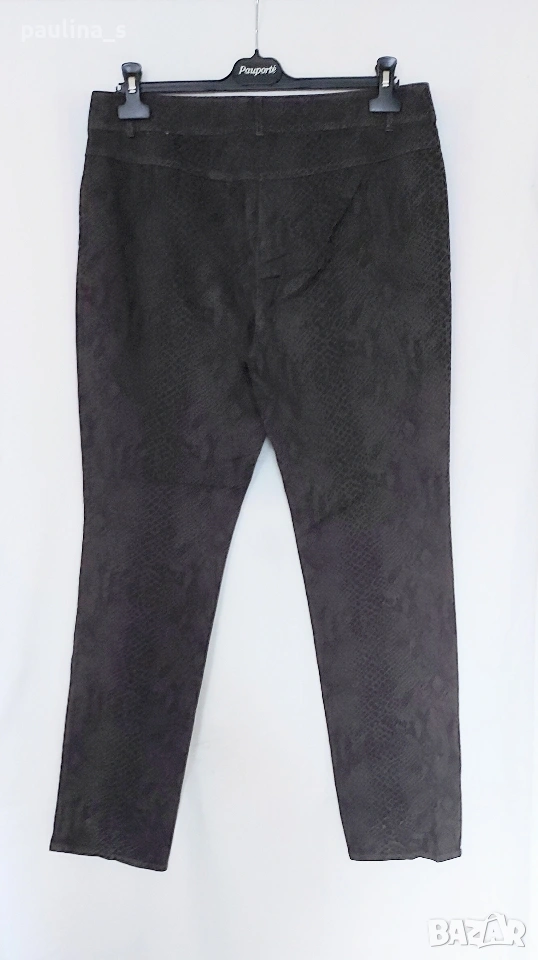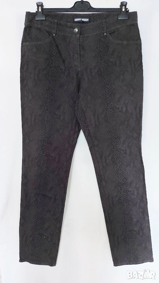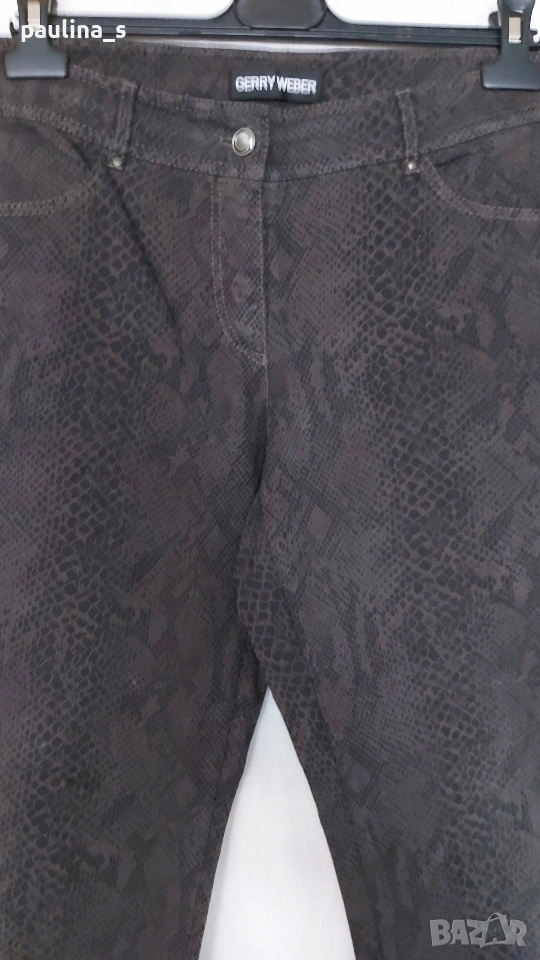 3️⃣. XL / 2XL - "Gerry Weber". Цената е крайна, без пазарлъци 20 евро. Маркови еластични дънки, без задни джобове, прав обран силует, акцент е плата и змиииския принт. Талията е нормална "sitts on the waist". Материята е средно еластична с плюшен и релефен ефекти, изключително впечатляваща дреха. Като нови, без дефекти и етикет за състава. Платът е еластичен микрофибър, със съдържание на памук.