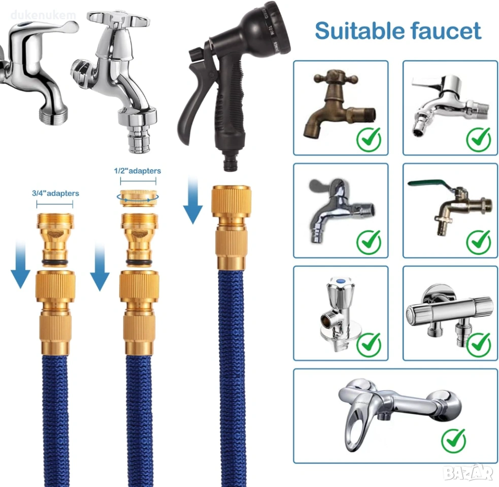 Универсални накрайници – 1/2" и 3/4", съвместим с повечето градински кранове