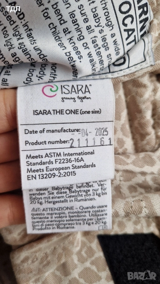 The ONE е най-новият модел регулируема ергономична раница за бебе на Isara. Създадена е да бъде All-in-one или иначе казано да удовлетвори наистина всички нужди и предпочитания на семействата с малки деца. Това е и раницата с най-голям диапазон на настройки, създавана досега. Иновативна система позволява прецизно регулиране във всички посоки, като това, на практика, я прави първата ергономична раница, която е подходяща за родители с всякакво телосложение – от най-дребните до най-едри фигури! А благодарение на допълнителни разширители, платката за бебето се оразмерява в изключително голям диапазон лесно и прецизно. Една носилка, подходяща за абсолютно целия период на бебеносене – от малко бебе до пораснало дете, като във всеки етап се гарантира правилна ергономична позиция за тазобедрените стави и гръбнака на бебето/детето ( 3м.- 48м. възраст). Страхотно, нали? Сгушени сърце до сърце, ще можете да изследвате света заедно с вашето бебе, а Isara The ONE ще ви е верен помощник ден след ден, година след година… С какво се отличава ергономичната раница Исара The ONE: Изработена изцяло от 100% органичен памук с GOTS сертификат, в серия от канвас и тъкан слингов плат. 3 позиции на носене. Отпред и бебето с лице към родителя, на хълбок ( след 6м. възраст) и на гръб (за седящи самостоятелно бебета). Регулираща се дължина на подплатената част на презрамките от 39-59см. и максимална дължина 118см. Опция за кръстосване на презрамките, освен стандартното паралелно ползване. Свързващ презрамките ремък, който може да се маха при кръстосване. Мек и добре поддържащ колан за кръста на родителя, който се регулира също в широк диапазон и подсигурява отлична опора при продължително носене. Опция за регулиране на ширината на платката, в която седи бебето от 15см. до 66см. Опция за регулиране на височината на платката, в която седи бебето от 30см. до 45см. The ONE може да се ползва от 3кг. до 20кг. по данни на производителя, като нашата препоръка е от 3м. възраст и височина поне 60см. Допълнителни разширители, които позволяват носене и на голямо дете (приблизително до 4г. възраст) Isara The One предоставя максимално добра ергономична позиция на бебето/детето във всички етапи на неговото развитие и е призната, като продукт „Здрав за тазобедрените стави„ от Международния институт по дисплазия на тазобедрените стави. Качулка, която предпазва главичката на бебето от слънце, вятър и др. Подкрепя главичката по време на сън и позволява дискретно кърмене. Омекотени зони в платката около коленцата и ръчичките на бебето за максимален комфорт по време на носене. Изработена изцяло от висококачествени материали, които са безопасни и издръжливи във времето. Подарък ни е, но не е ползвана.