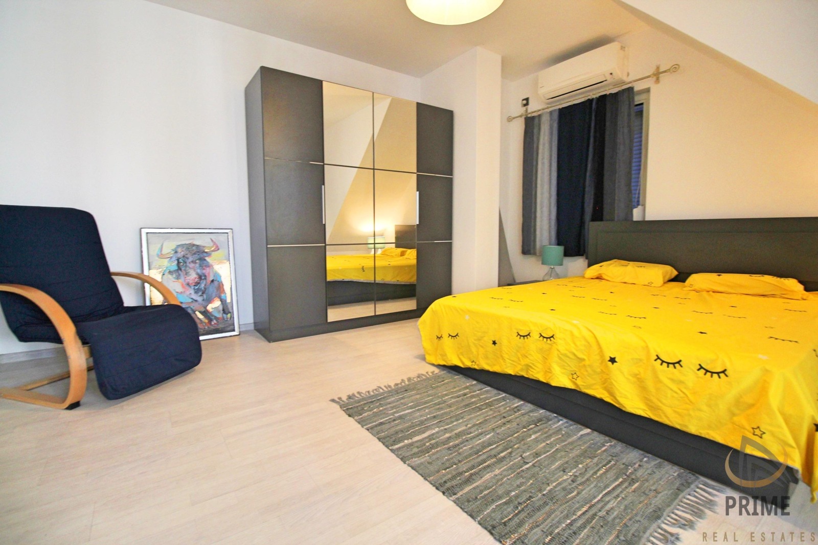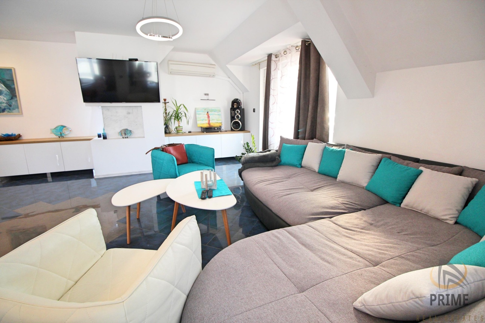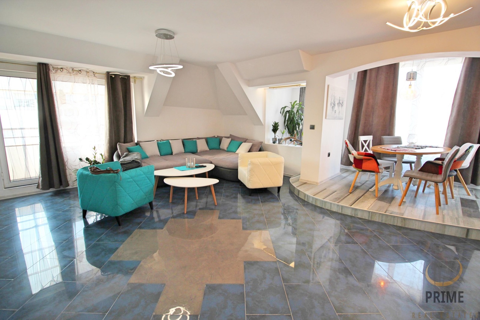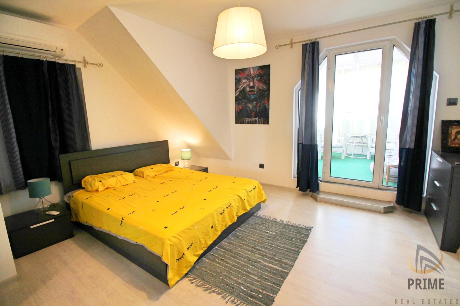 РАЗПРЕДЕЛЕНИЕ: мезонет на две нива: с голям хол с кухня и трапезария с тераса, мокро помещение, две спални, баня с тоалетна и втора тераса на горния етаж.