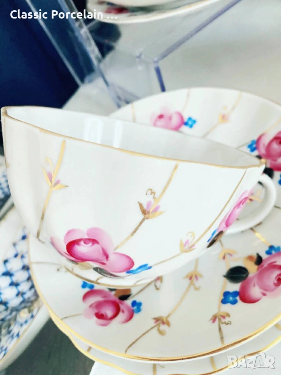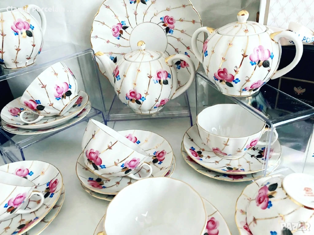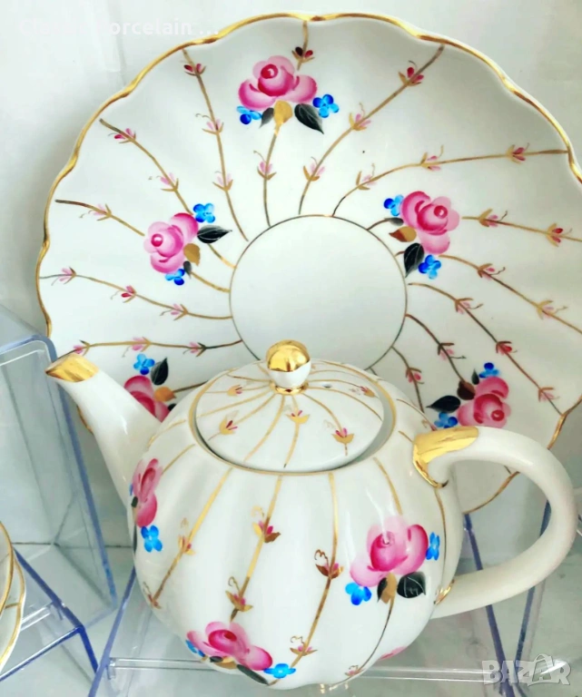 Прекрасен винтидж порцеланов сервиз, декориран с нежни розички и изящна златна мрежа. Подглазурният декор е с прецизно ръчно дорисуване със злато, което придава елегантност и празничен вид. Цветовете и орнаментът хармонично се съчетават с класическата форма на изделията, характерна за продукцията на ЛФЗ от този период.
