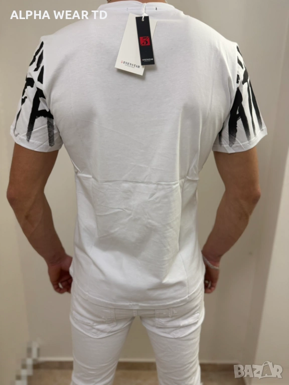 Мъжка тениска в бял цвят с ефектен черно-графичен принт в горната част и върху ръкавите. Модерен дизайн с контрастни надписи, който придава смел и актуален streetwear стил. Класическа кройка със скъсен ръкав и обло деколте, която подчертава силуета и осигурява комфорт през целия ден. Подходяща както за ежедневни визии, така и за комбиниране с дънки или спортно-елегантни панталони.