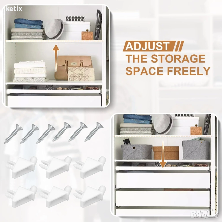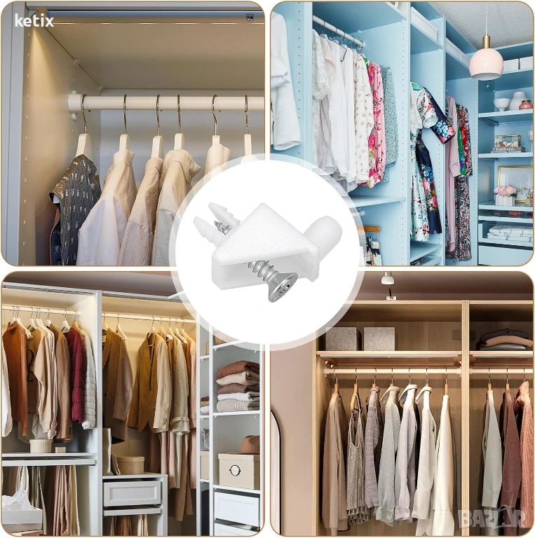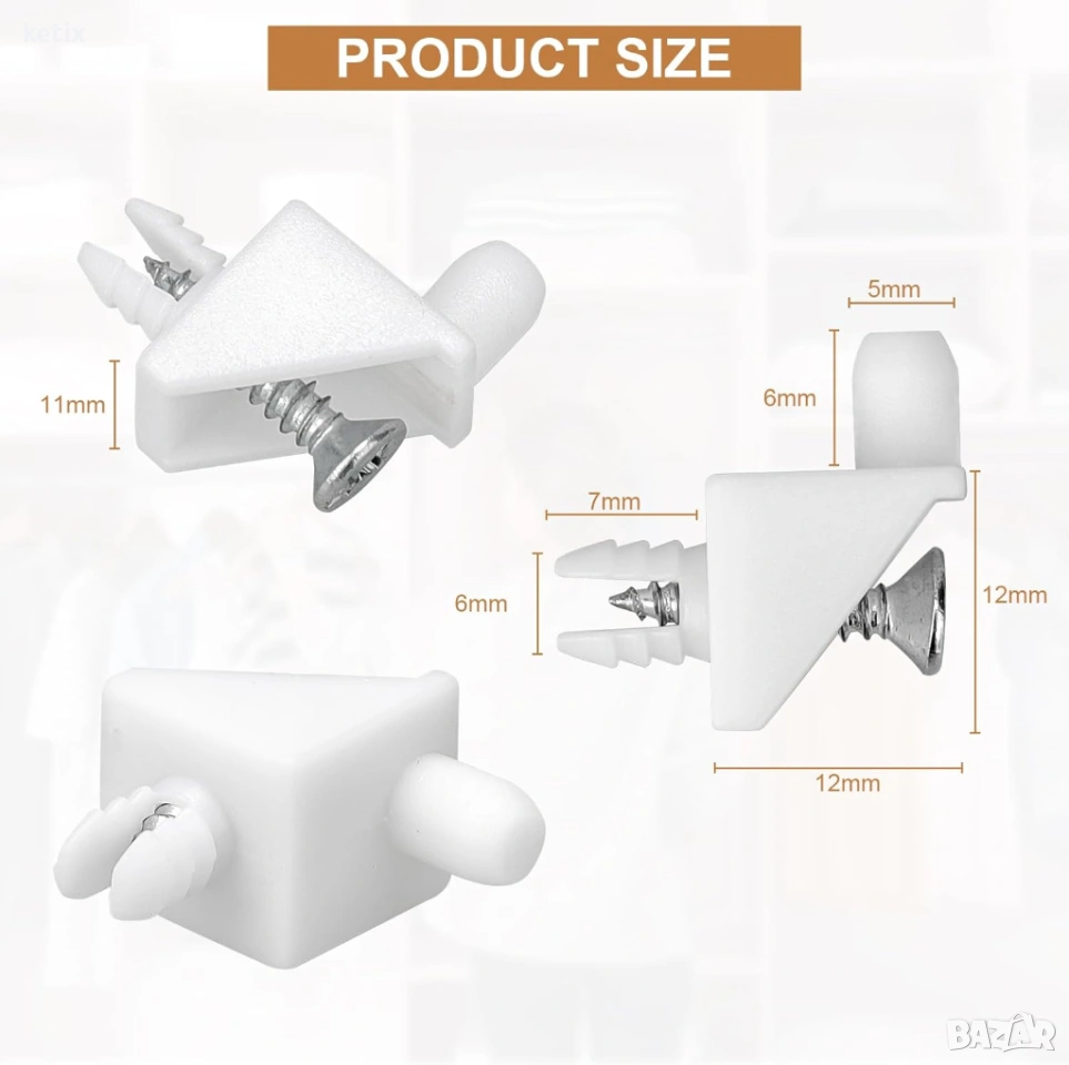 Спецификации: Комплектът включва 30 бели носача за рафтове. Размери: диаметър 5 мм. Материали: твърда пластмаса и метал.