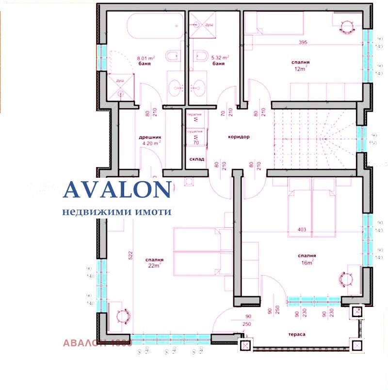 ет. 2 - 3 големи спални - една родителска със самостоятелна голяма и светла баня с тоалетна, дрешник и излаз на тераса, две детски стаи, баня с тоалетна и отново дрешник/склад в антрето.