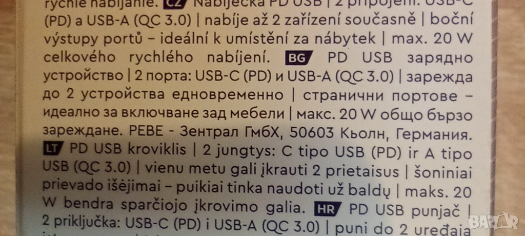 Зарядно за USB- едновременно зареждане на 2 устройства, удобно е да се постави зад мебели