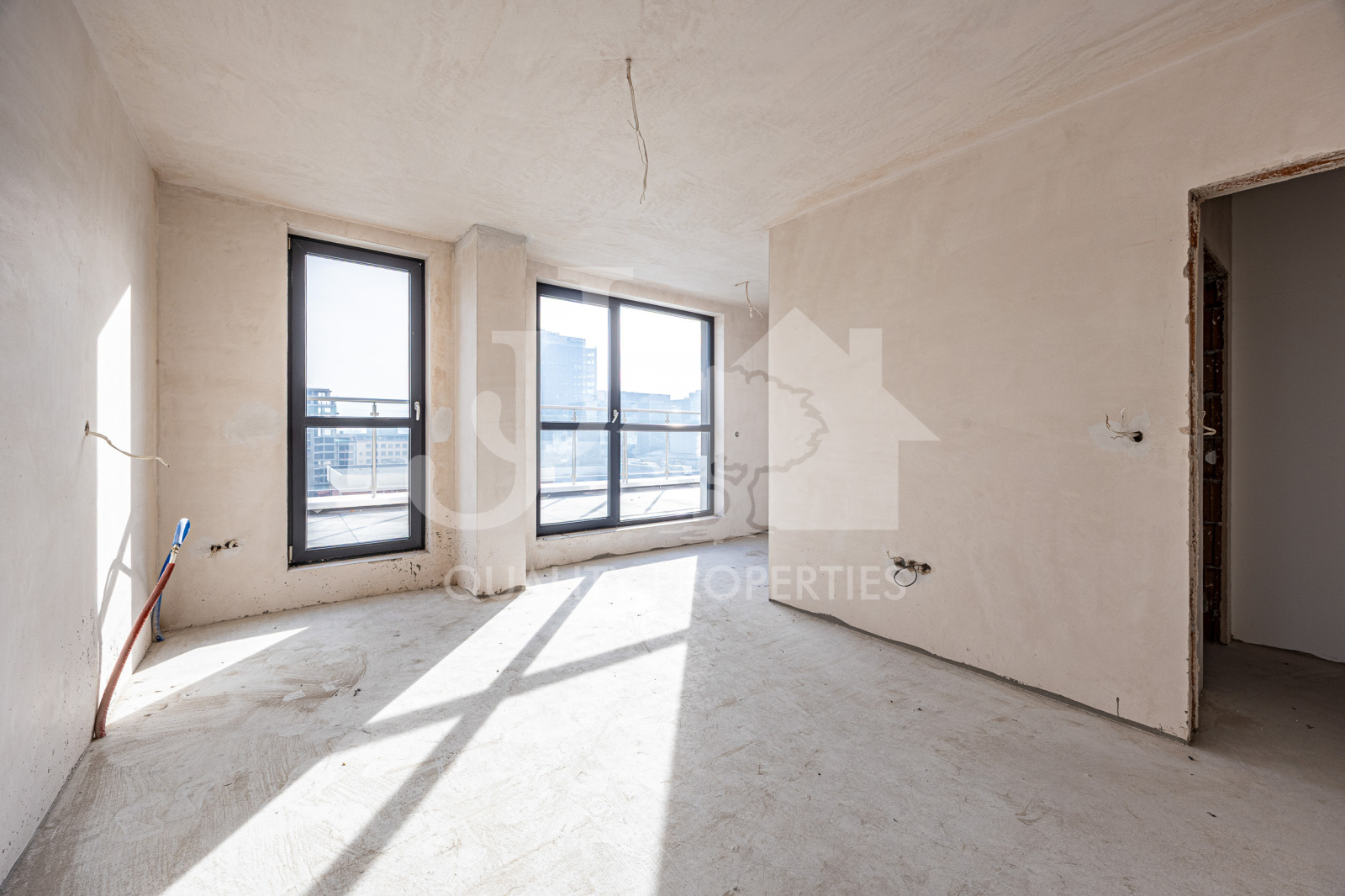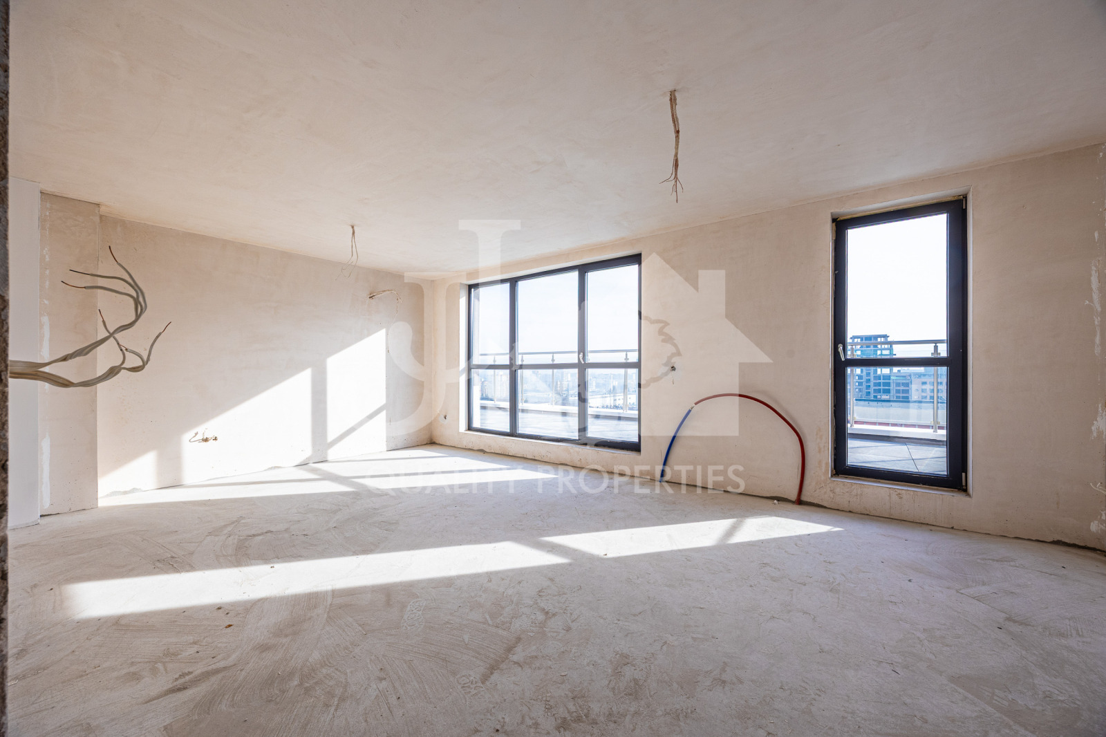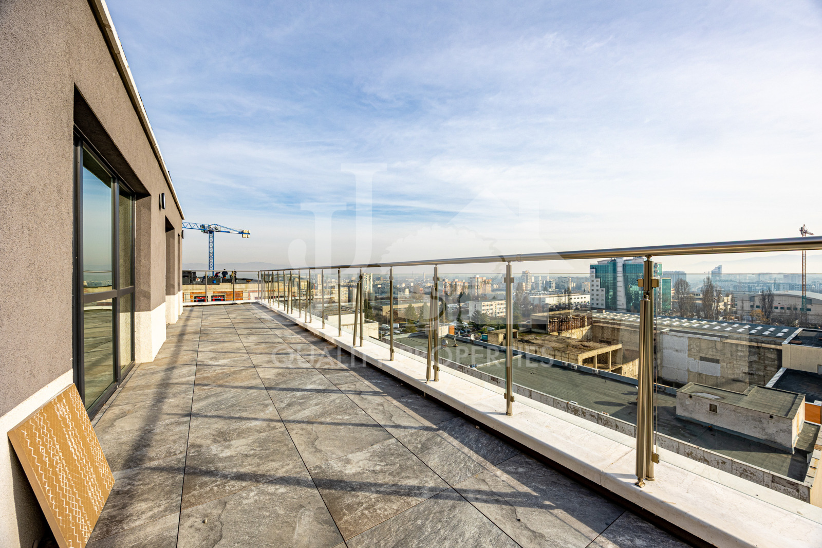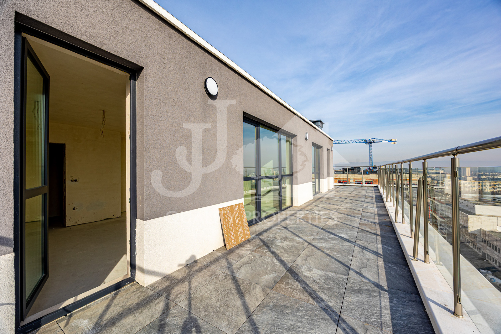 JJCorporation предлага на Вашето внимание 4-стаен апартамент, намиращ се на 11-ти етаж, в сграда пред Акт 16, със ЗП 128,76 кв.м, и РЗП 151.97 кв.м, и прилежаща тераса към него, с РЗП 153,55 кв.м. Апартаментът е с изложение изток-запад-север и следното разпределение: входно антре, просторна всекидневна с трапезария и кухненски бокс, просторна спалня с гардеробна и баня към нея, втора просторна спалня с баня към нея, още една, трета - спланя и допълнителна баня със санитарен възел. Всички жилищни помещения имат излаз на просторната тераса.