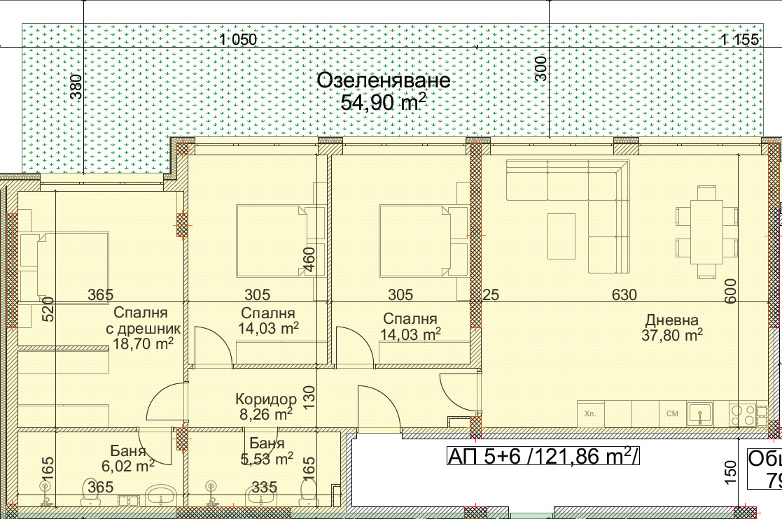 - дневна с кухненски бокс с площ 37,80 кв.м.