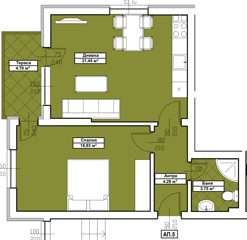 - дневна с кухненски бокс с площ 21,45 кв.м.