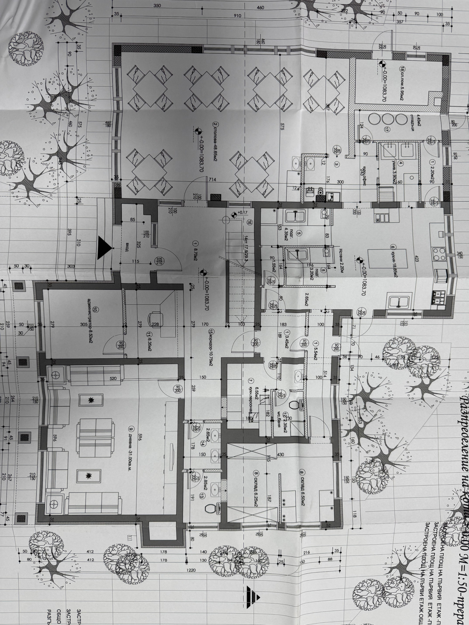Първият етаж-преустройство и пристройка, на кота +/- 0.00, разполага с входно предверие, столова, кухненски блок, обща дневна, стая за администратора. Вдъното на коридора е обособен нов санитарен възел-умивалня с wc.