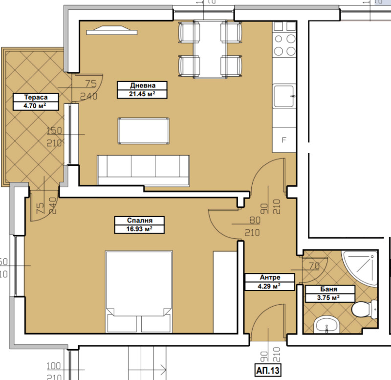 - дневна с кухненски бокс с площ 21,45 кв.м.
